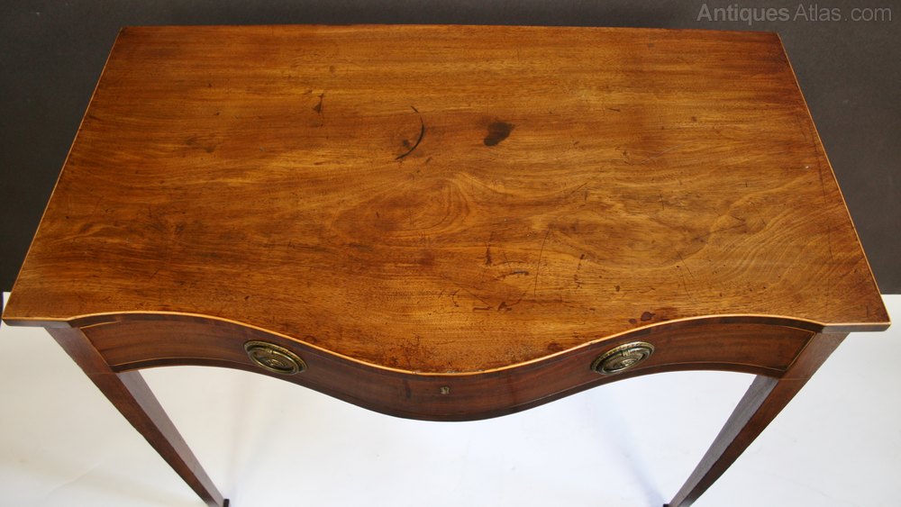 George 111 Mahogany Serpentine 1 Drawer Side Table. The top having boxwood outline stringing as has the oak lined drawer also having the original brass ring handles. Boxwood and ebony outline stringing below the drawer, the sides and over the square tapered legs which have spade feet.