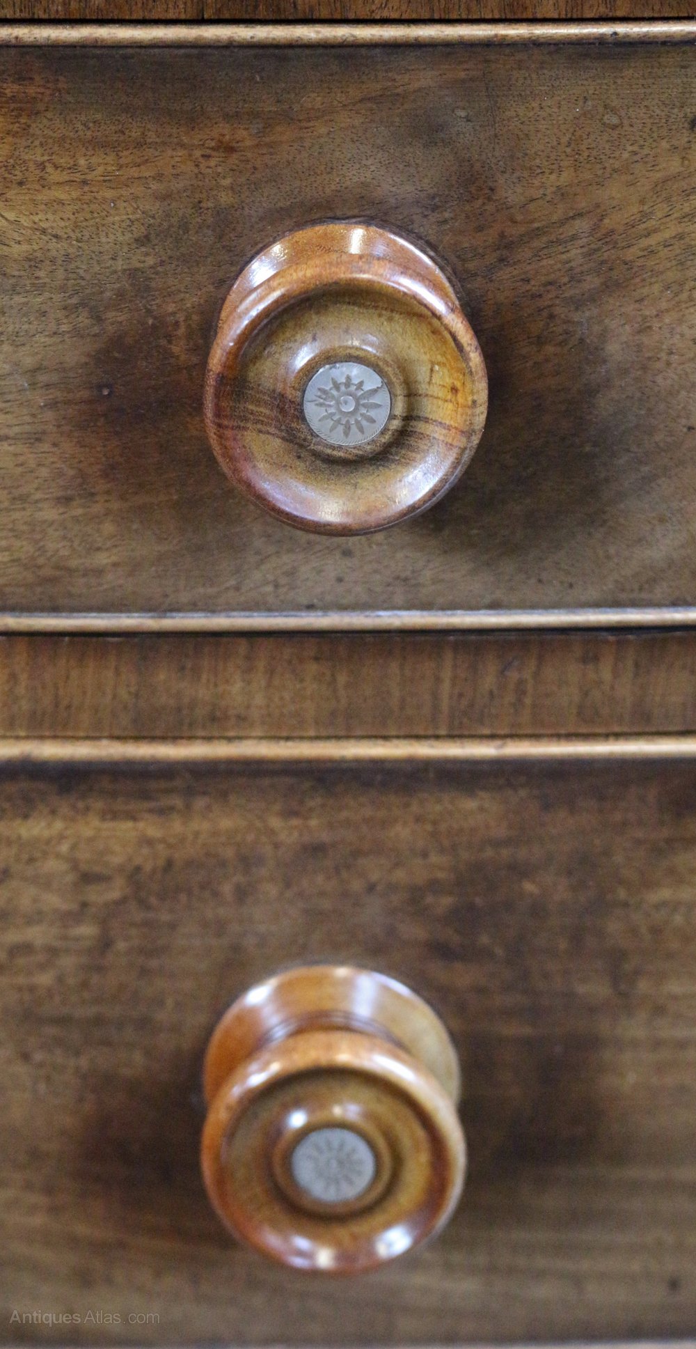 George 1V Mahogany 4 Drawer Small Bow Chest. The flush top having cross banded side edges. The 4 oak lined drawers having the original blue sugar paper floor linings and the original fruitwood turned knob handles with central Mother of Pearl engraved roundels. Cross veneered drawer divides. All on splay feet with shaped apron.