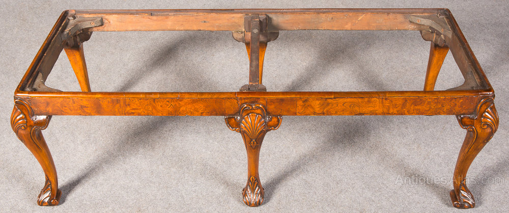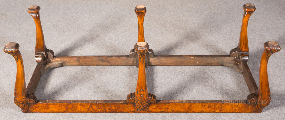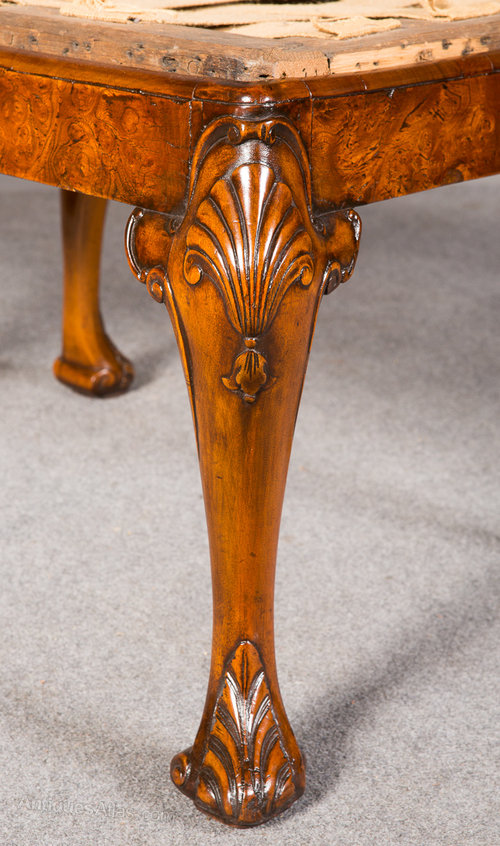 An unusual walnut and burr walnut 6 legged stool / window seat in the George I style. The cabriole legs with carved shell and harebell decoration. The scroll feet with further carved detail. The drop-in seat is ready for your choice of upholstery and sits within a cross grain moulded frame.
