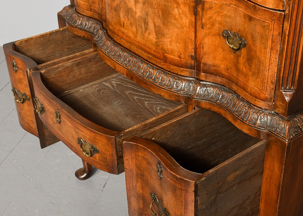 Circa 1900. George 1st style crossbanded, figured walnut chest on stand with a lovely mellow colour. The polished top in quarter-matched figured walnut, above a moulded segmented cornice and 4 shaped-front graduated drawers with crossbanding, herringbone inlay, engraved cut brass handles and escutcheons, and solid oak drawer linings. The upper section with canted corners. The base with a foliate carved moulding and two short and one long drawer with matching details, all supported on short cabriole legs with shell carved knees and pad feet.