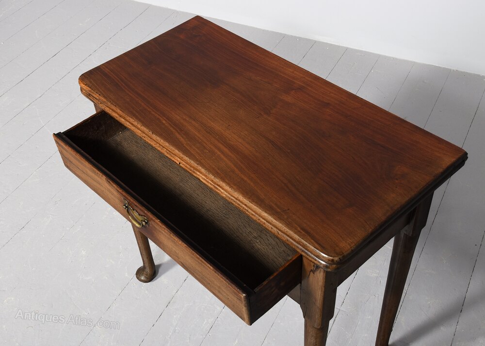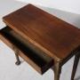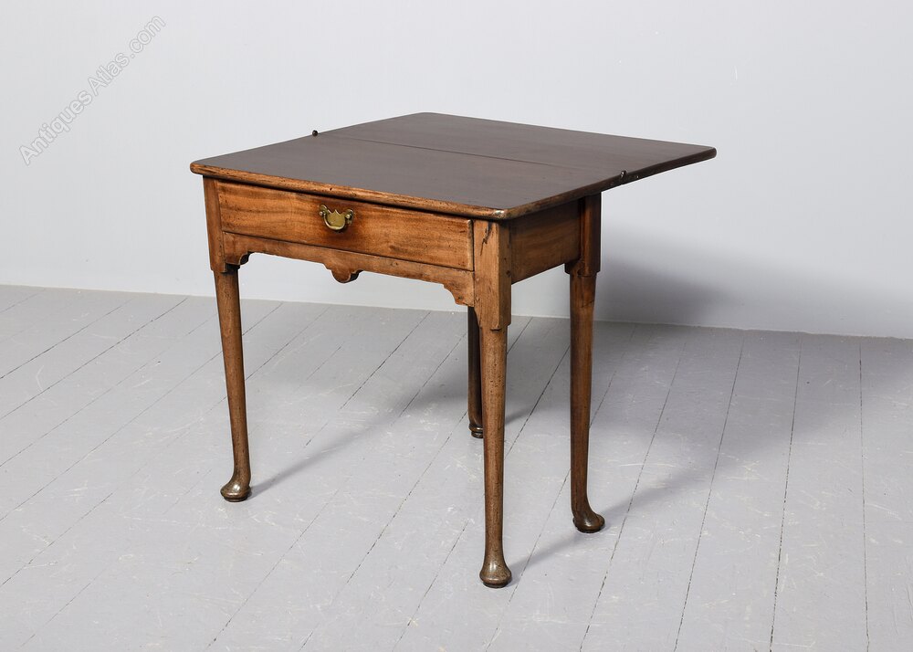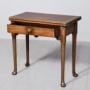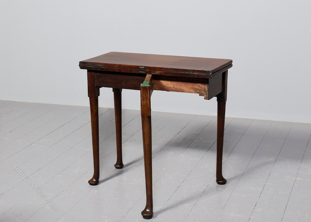 Circa 1750. A late George II red walnut fold over tea table, the top in lovely figured walnut with great colour, hinges and opens to reveal a polished interior, the front with a full length drawer, which is oak lined, with original a cast brass swan neck handle and solid brass back plate, with a shaped frieze, resting on four club legs, one of the back legs is hinged and swings out to support the table top when open, with the peg joints clearly visible throughout, all finishing on a simple circular pad foot.
