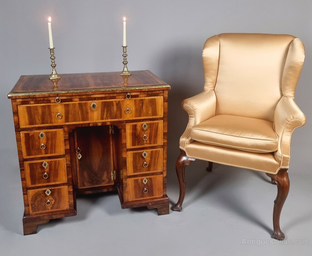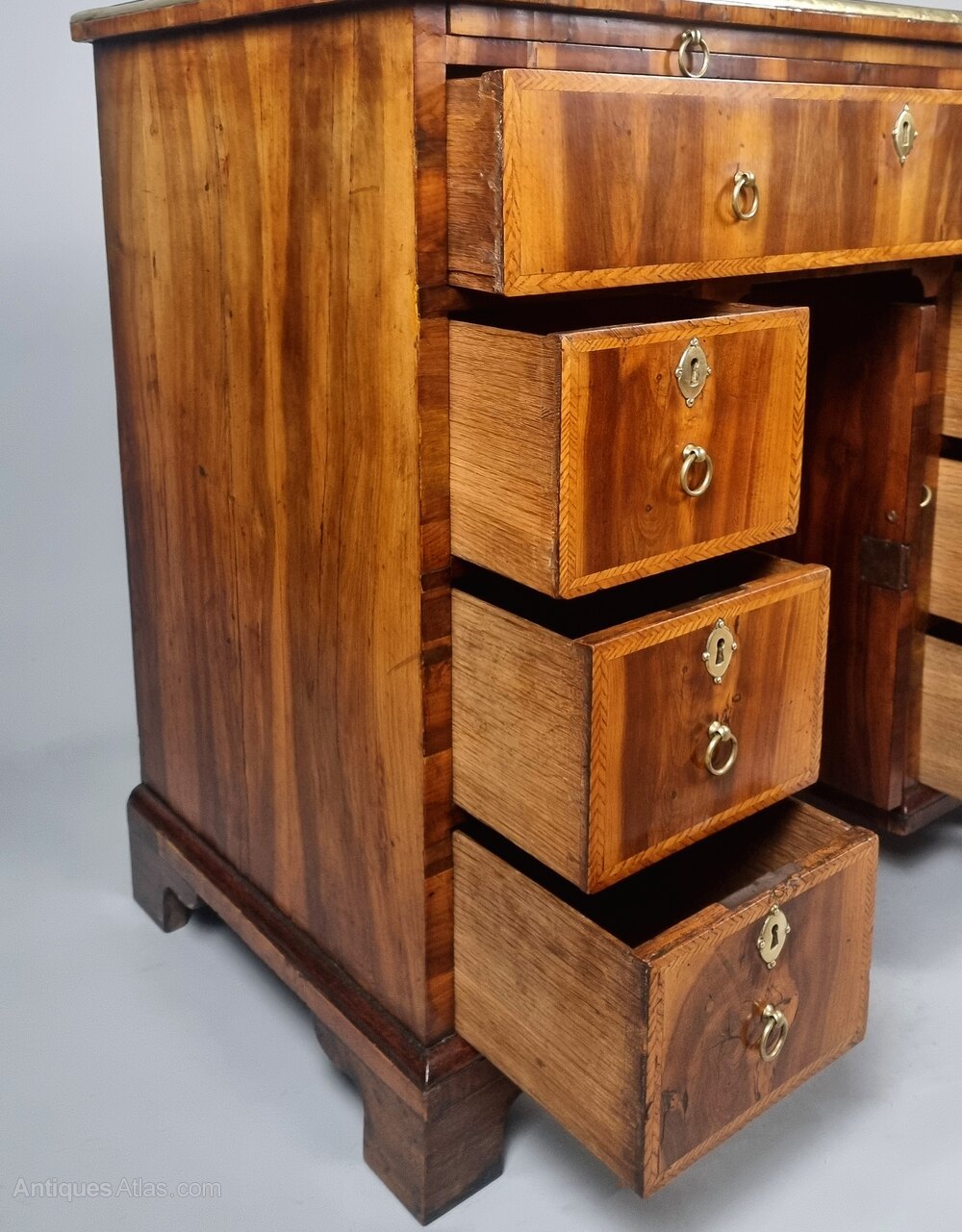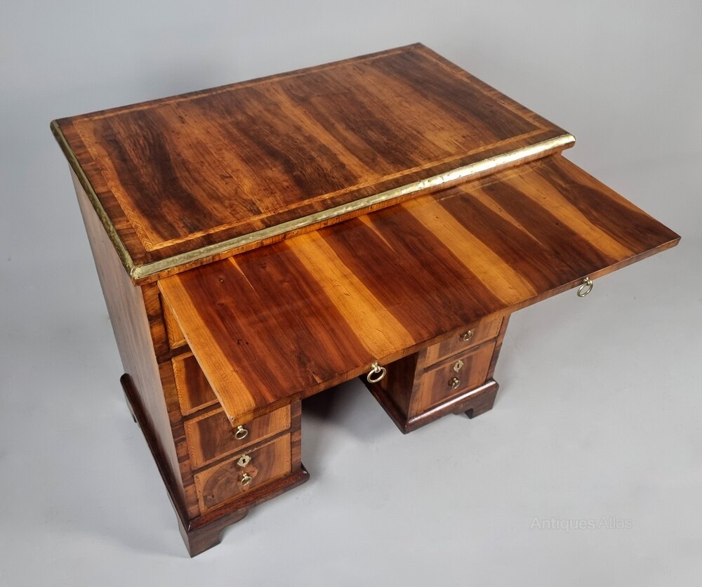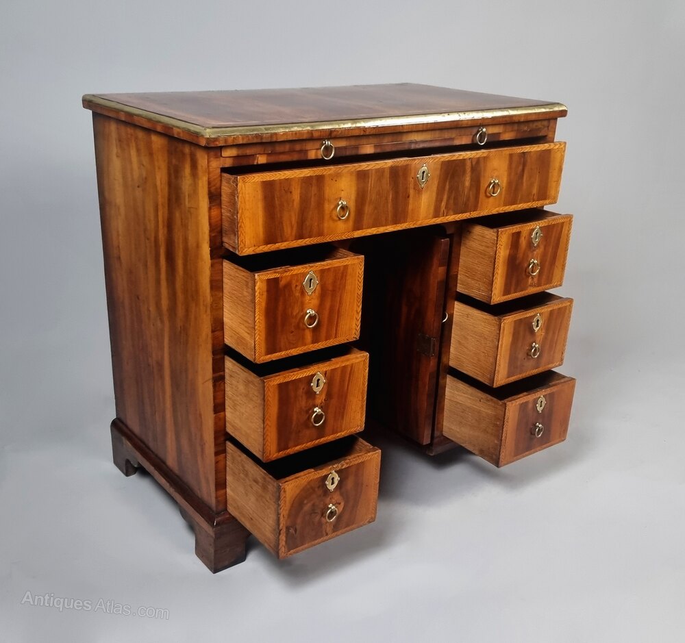 Of the finest quality and in exceptional original condition, with original brass banding to the bookmatched yew wood top, original brass handles and escutcheons, wainscot oak lined drawers, original brass H hinges to the kneehole door, yew brushing slide and original steel locks.