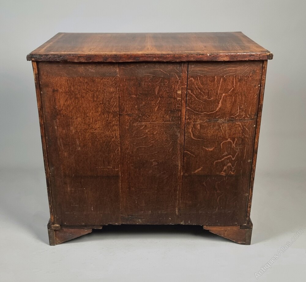 Retaining original drawer linings, bracket feet and backboards. The drawers run smoothly and are beautifully made with very fine dovetailed joints and beautiful inlaid borders to the drawer fronts and to the top. The sides and brushing slide are also dressed in yew wood.