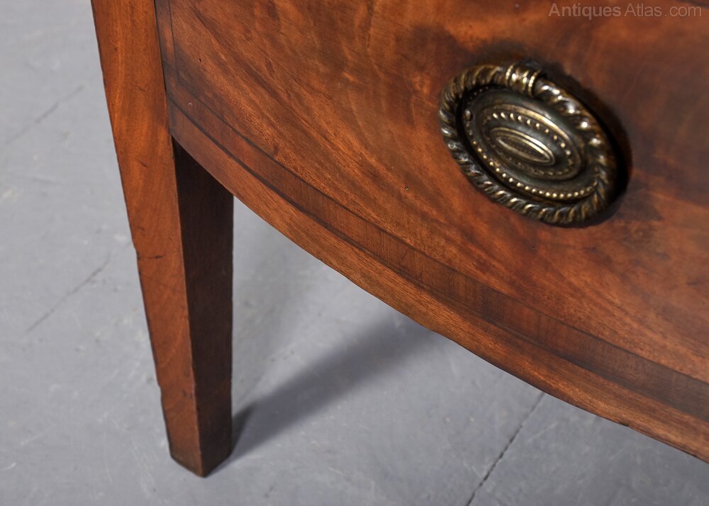 Circa 1800. A late George III mahogany bow-fronted commode, the top in finely figured mahogany with a simple moulded fore-edge, the front with a pair of bow-fronted doors, crossbanded with flame mahogany panels and cast brass knob handles with back plates, beneath there’s a faux drawer with similar banding and an oval handle, the commode rests on four square tapering legs.