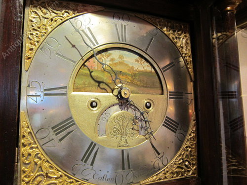 A Good George III Oak and mahogany crossbanded 30 hour longcase clock made by Adam Costen of Kirkham(Lancs).c.1770.Brass and silvered dial with painted scene to the centre.Date aperture below.Turned columns and shaped door to the case repeated to the moulded cornice hood.Strikes on a bell to the hour.Stands 82"high.Full working order.