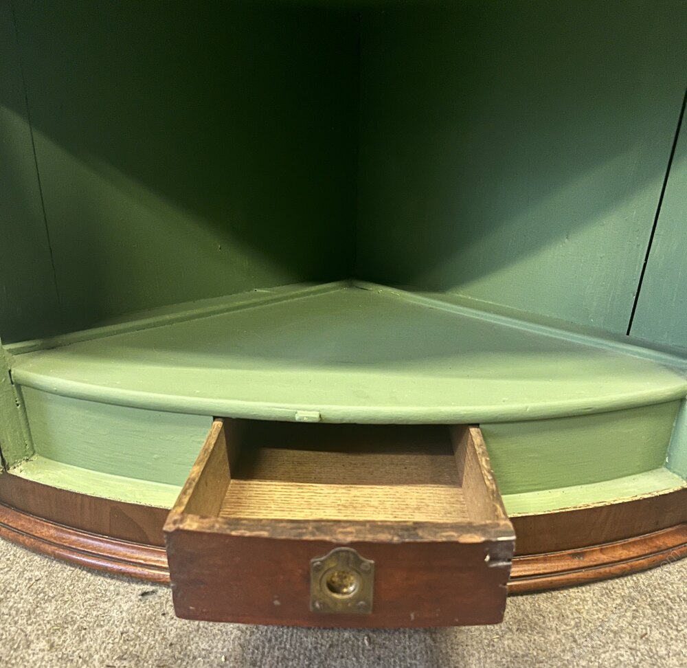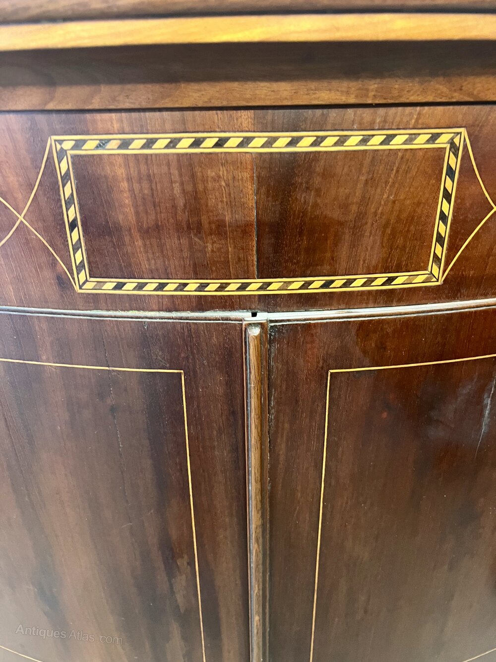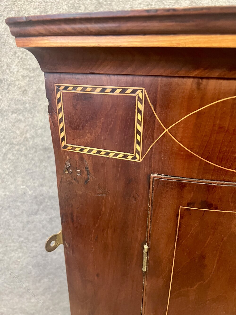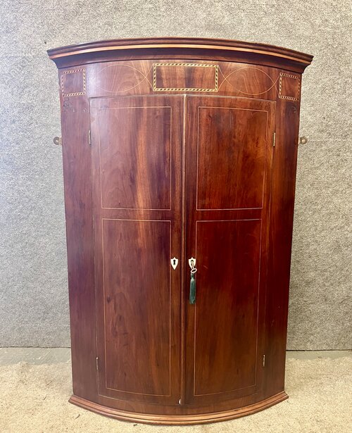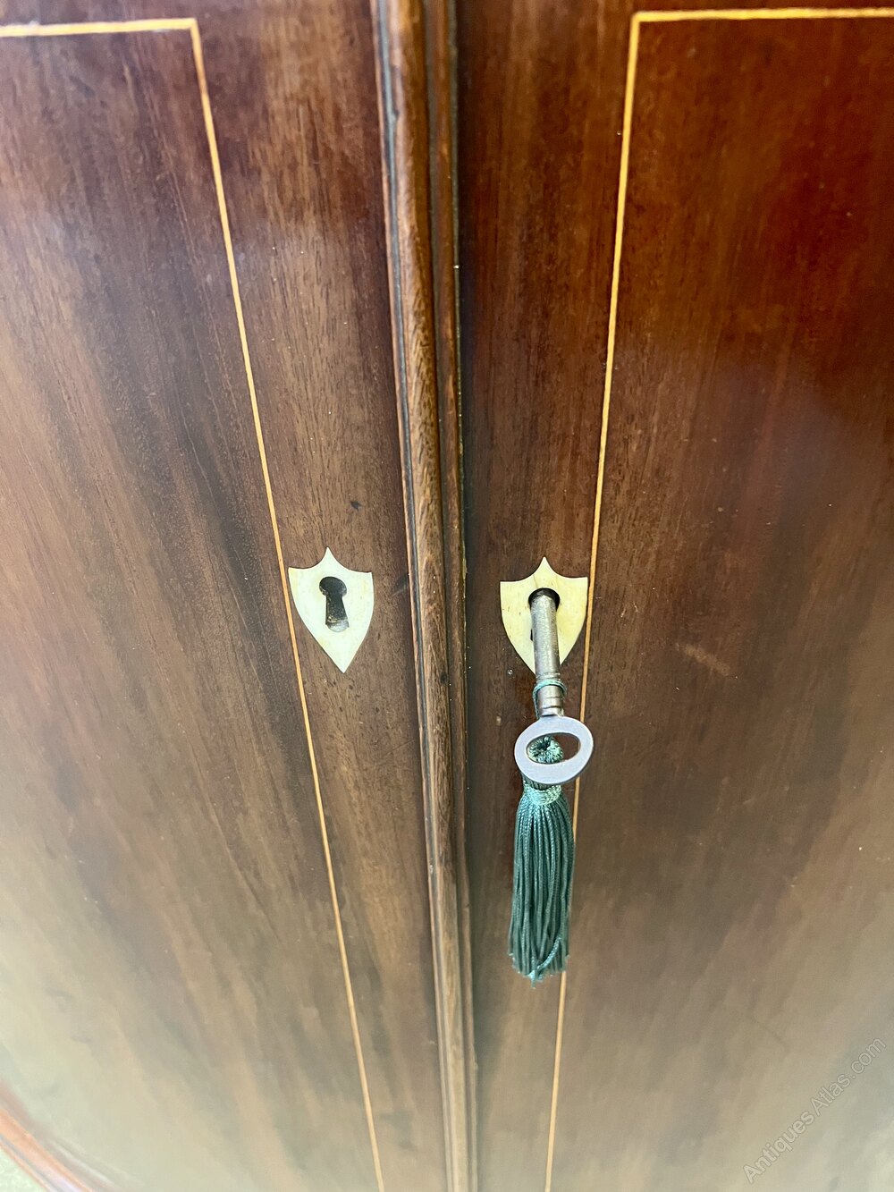An attractive George III bow fronted hanging corner cabinet constructed from fine figured mahogany with boxwood and ebony inlay. The moulded cornice above the inlaid frieze leading to the 2 doors each with outline stringing inlay. The doors open to reveal a green painted interior with 4 shelves and a bow fronted drawer. The cabinet benefits from a replaced antique working lock and key. The whole in good original condition with working lock & key. Dimensions:- Height…44''/ 112cm. Max.Width…30''/ 76cm. Depth…19''/ 48cm. Side Depths…20.5’’/52cm. Delivery to most of U.K. mainland £55.
