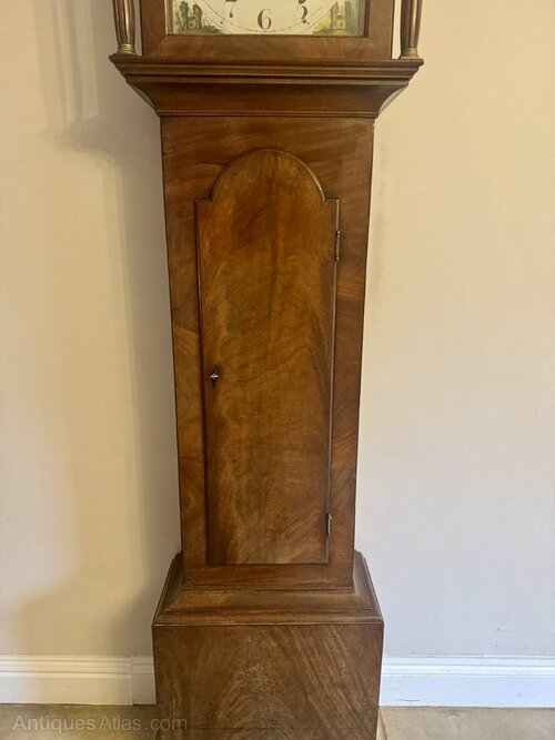 Quality antique George III mahogany arch dial long case clock, having a quality antique George III mahogany long case clock, having an unusual scrolled pediment above a square shaped hood with twin fluted columns with brass capitals and bases flanking a single glazed door casing a arched dial, the arch featuring a pastoral landscape scene above a painted circular dial with black English numeral's with black ornate hands, having a smaller sub dial for the seconds, the dial signed Russell Buxton, with a quality eight day movement striking on a bell, above a single arched door opening to reveal the original weights and pendulum, raised on a rectangular mahogany shaped base. Overall very good condition with the original winding key.