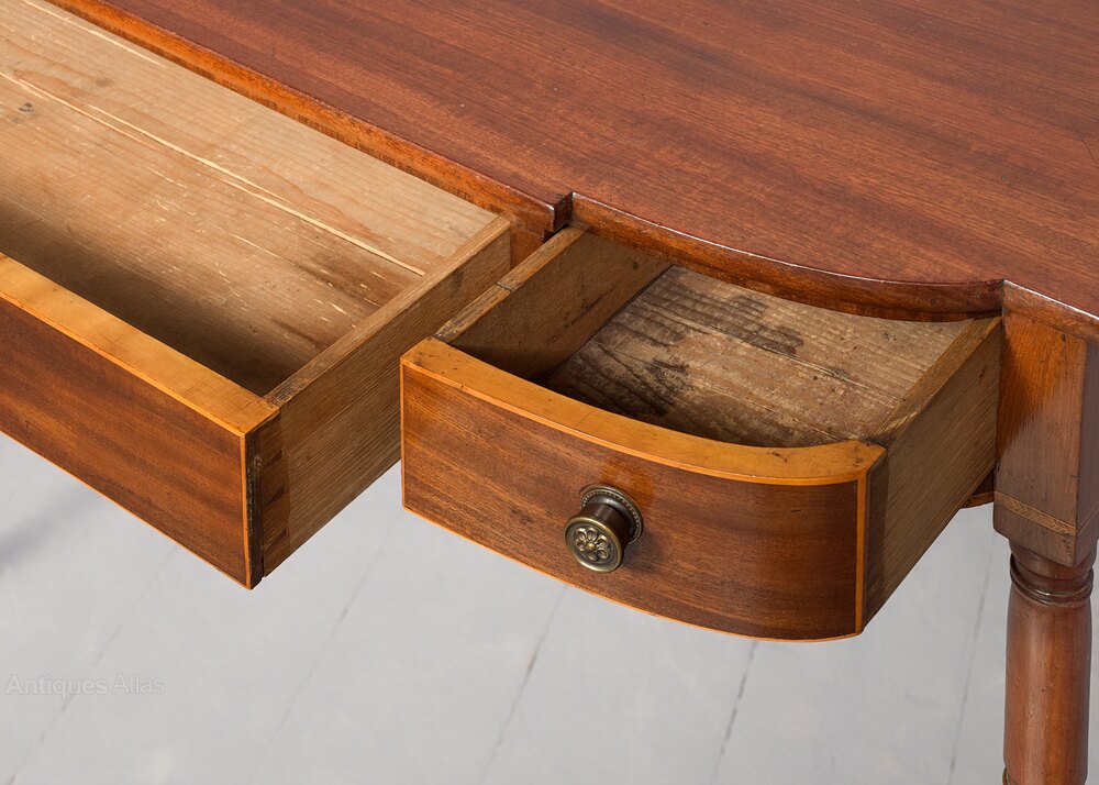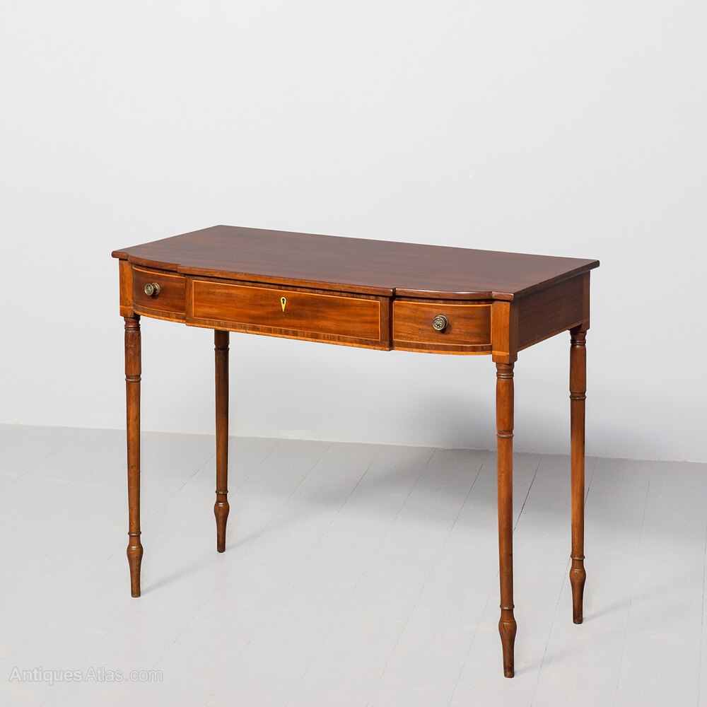 Circa 1800. A late George III mahogany inlaid breakfront side table, the top in well figured mahogany with a simple fore-edge, the front with one full length drawer with boxwood banding and a heraldic shaped escutcheon, flanked by 2 bow front drawers with cast brass knob handles, the frieze with herringbone banding which continues around the sides, the table rests on four elegant turned ring turned and tapering legs finishing on an extended bulbous section finishing on an elegant toe.
