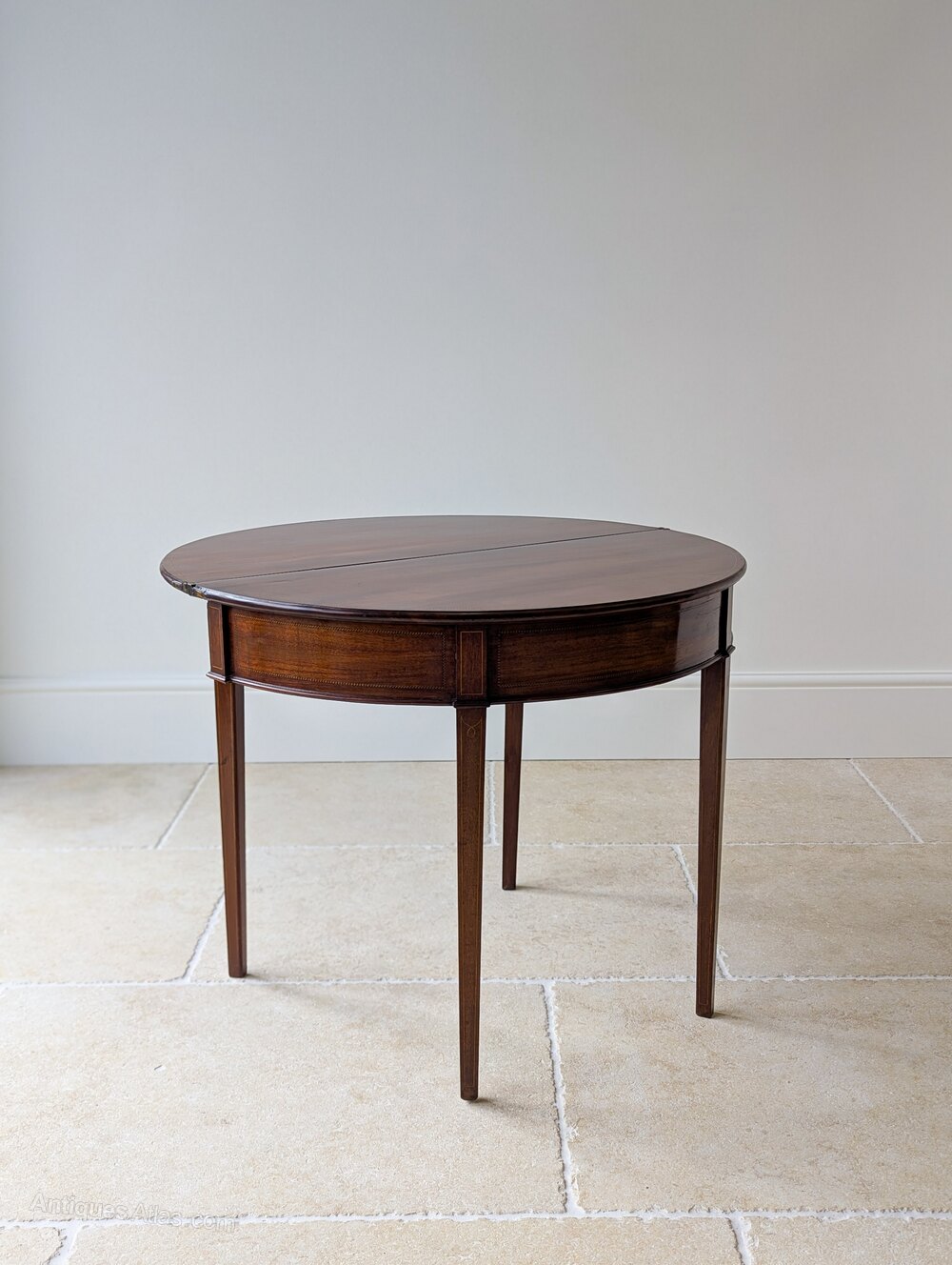 The craftsmanship and balance of proportion reflect the refined neoclassical influence of the Hepplewhite period and the piece is typical of well-executed late 18th-century work. Designed to sit neatly against a wall and when required, open into a full circular tea table. Its compact scale makes it an ideal piece for a hallway or living space.