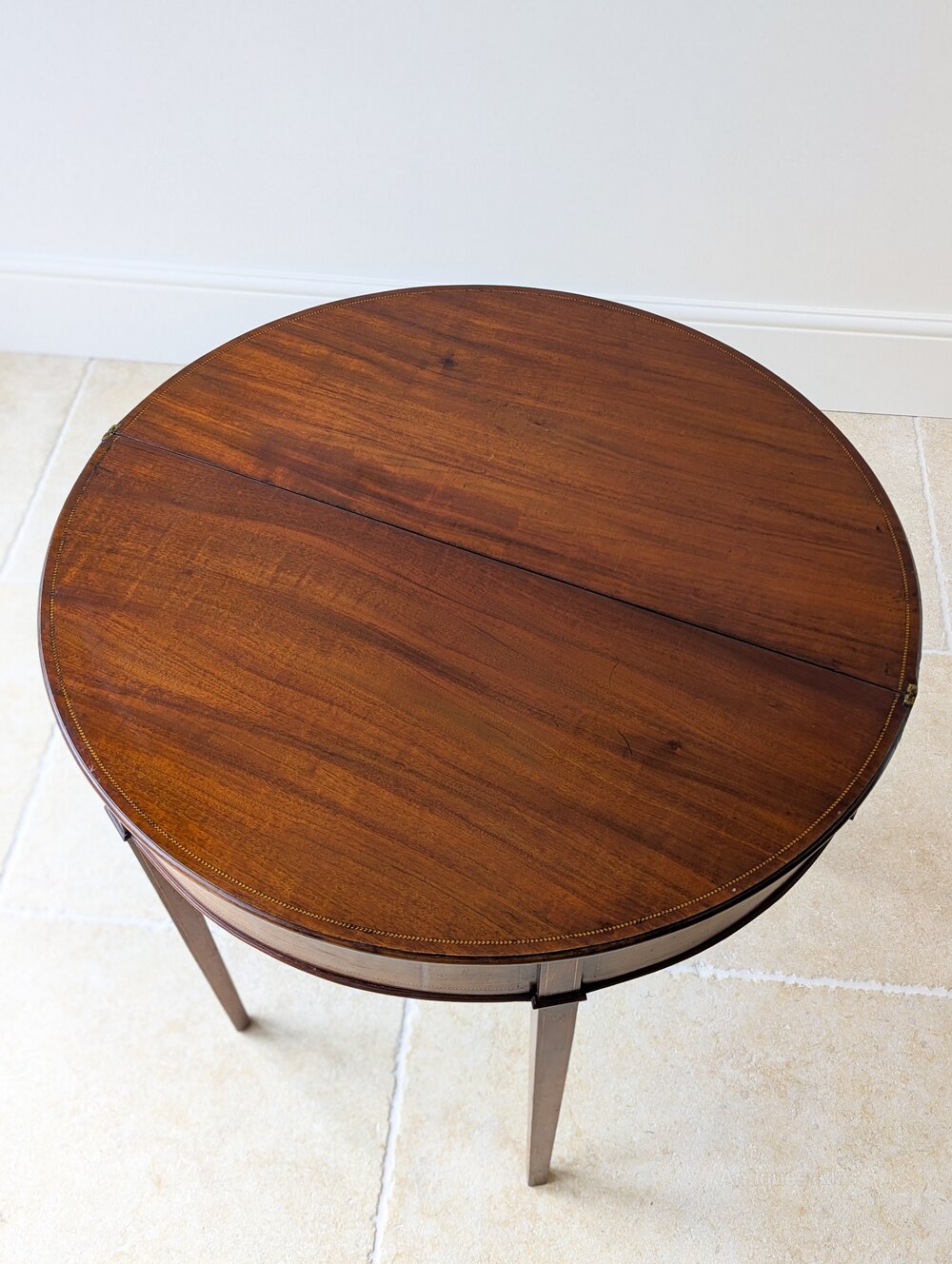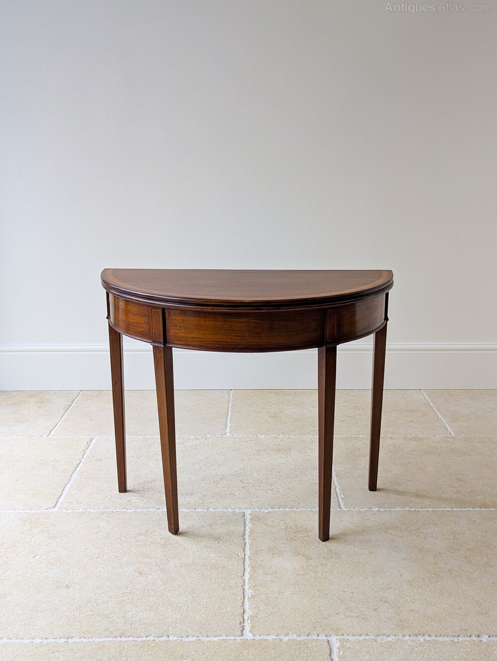A handsome George III inlaid mahogany tea table of demi-lune form. The hinged top is veneered in well-figured mahogany with a satinwood crossband and twin chequer stringing in boxwood and ebony, opening to reveal a polished mahogany surface edged with a chequer-inlaid border. The frieze is similarly detailed, with outlined panels above square tapered legs inlaid with boxwood lines.
