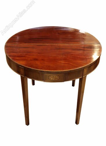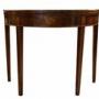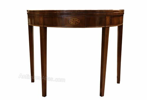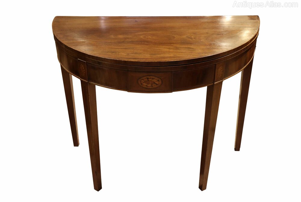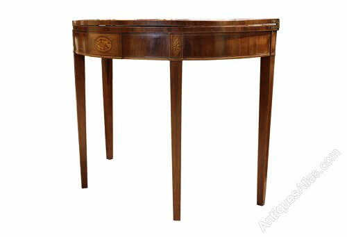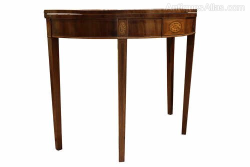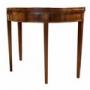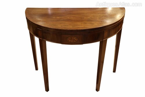A good George III mahogany demi-lune tea table. The frieze with inlaid patterae beneath the well figured top on square tapering string inlaid legs.