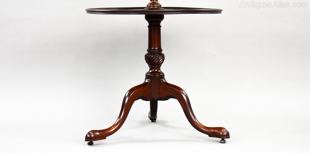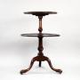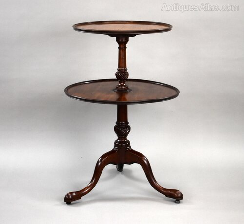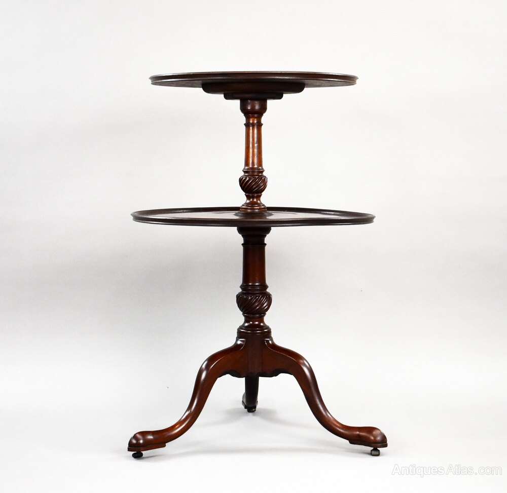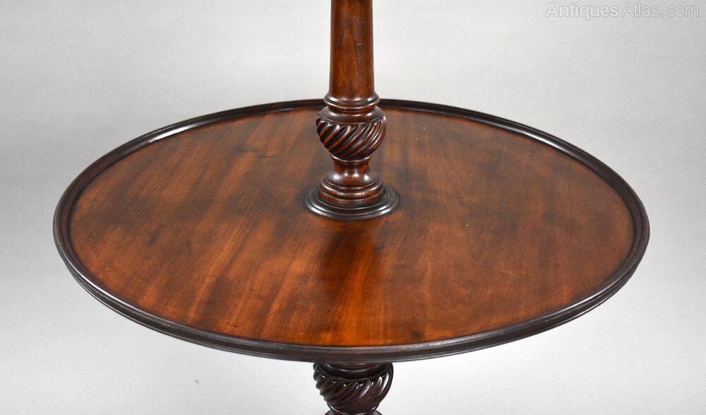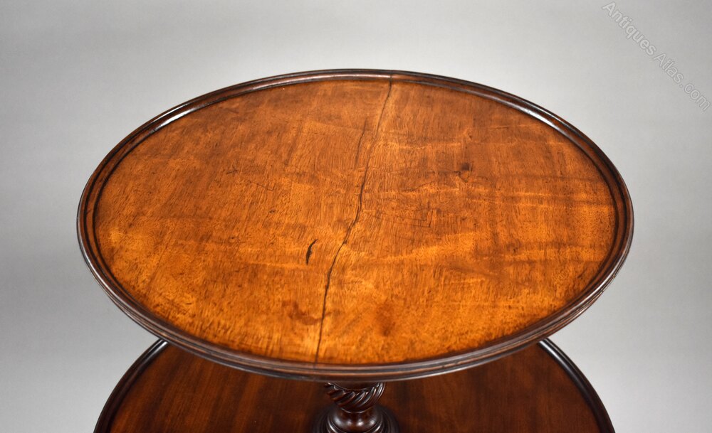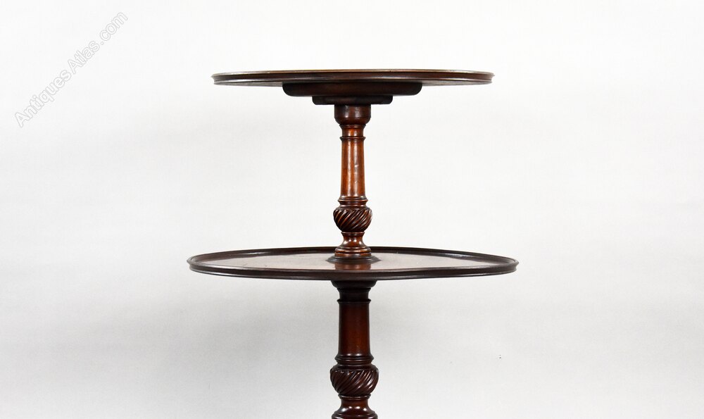 A fine quality George III mahogany dumbwaiter of elegant proportions, featuring two graduated circular tiers supported on a turned and carved central column. Each tier is edged with a subtle raised lip, ideal for displaying or serving. The well-turned baluster column is enriched with carved spiral reeding and terminates in a gracefully splayed tripod base.