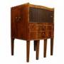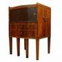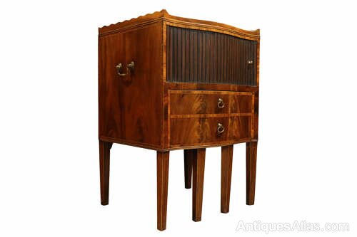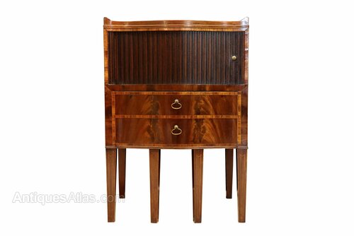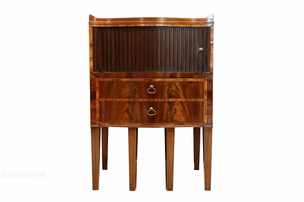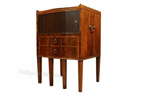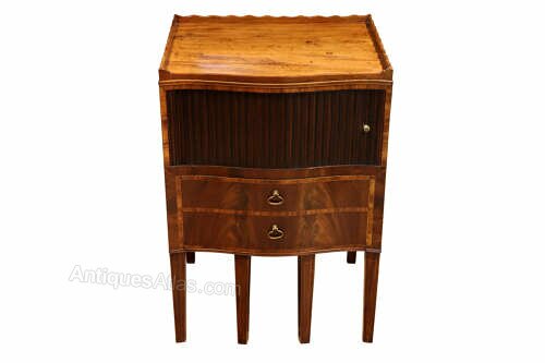 A fine late 18th-century bedside night table in well-figured mahogany, the serpentine front outlined with crossbanding and stringing. The upper section features an unusual and elegantly curved tambour door, opening to reveal a storage compartment. Beneath, a pull-out commode drawer retains its original circular aperture, with a further dummy drawer front below for visual balance.