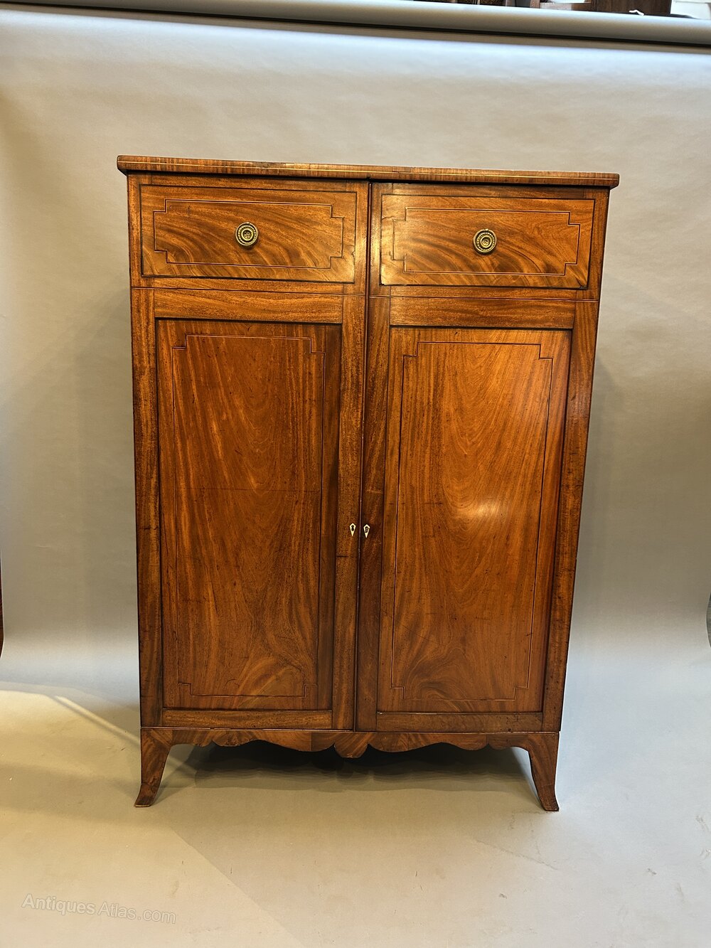 Late C18th wardrobe / linen press of smaller proportions, well figured mahogany the 2 panel doors inlaid as faux drawers above with gilt ring handles opening to reveal hanging space and a flight of slides, the whole raised on shaped apron and swept bracket feet.