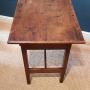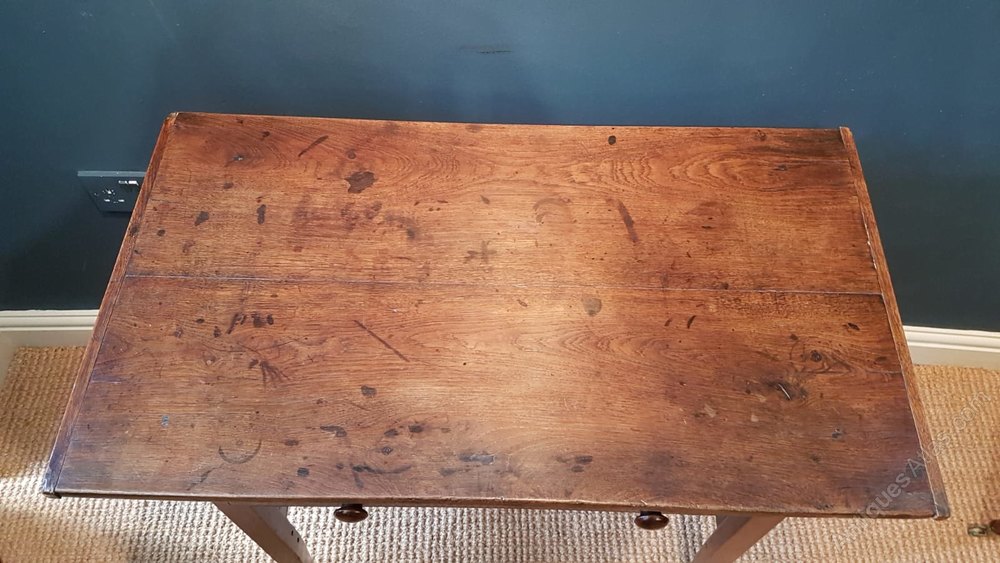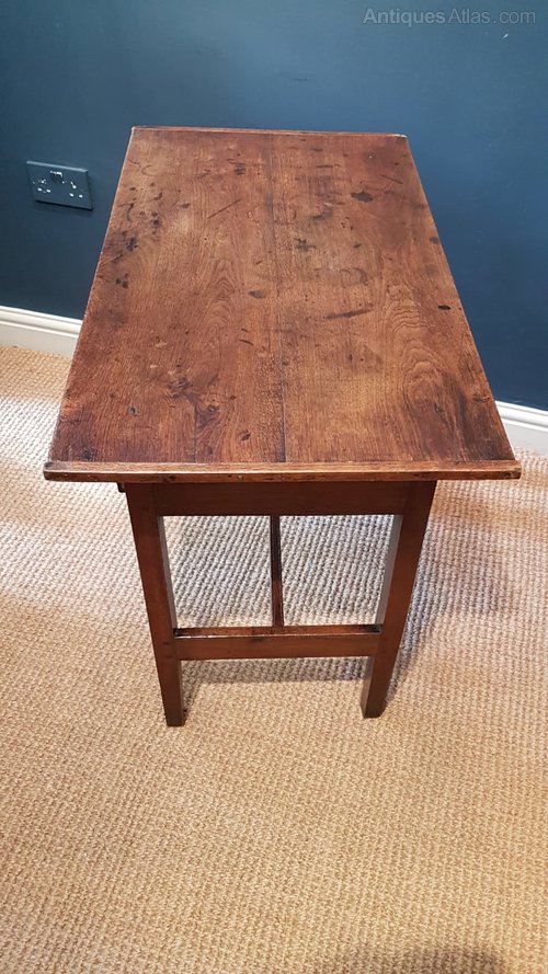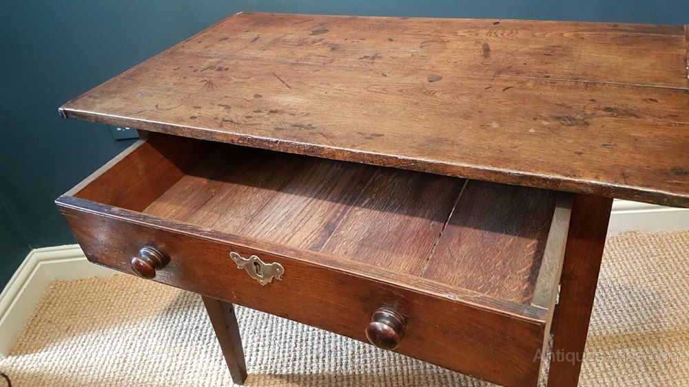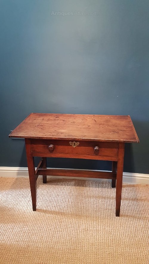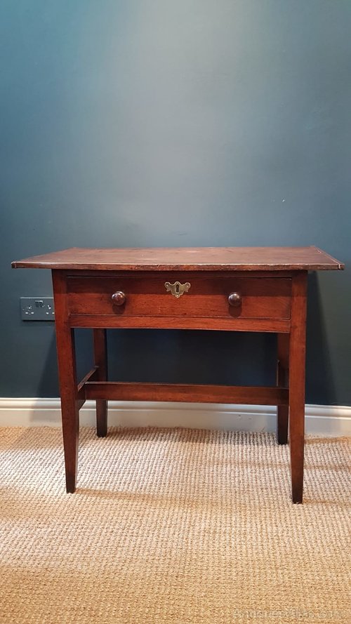 A stylish George III single drawer side table C.1790. The wide overlapped two plank top with cleated ends sat over a single drawer base. Simple square legs with central H stretcher and pegged joints. Original turned drawer knobs and brass lock escutcheon. Superb colour and original patina, very original. Measures 34" wide x 19" deep x 27.75" high. Stock number 36627.