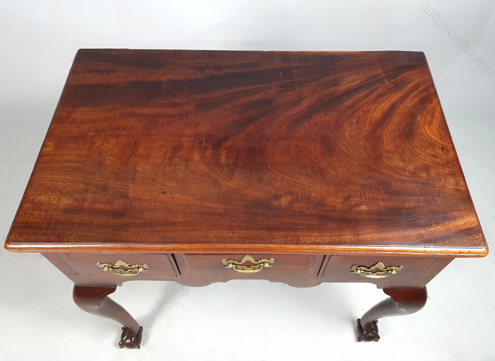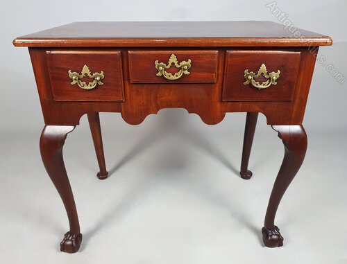 A wonderful small and beautiful red walnut lowboy with three drawers and original brass batswing and bail handles over a well shaped apron and all set on lovely long and elegantly shaped cabriole front legs terminating in substantial and original ball and claw feet.