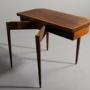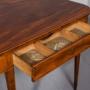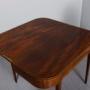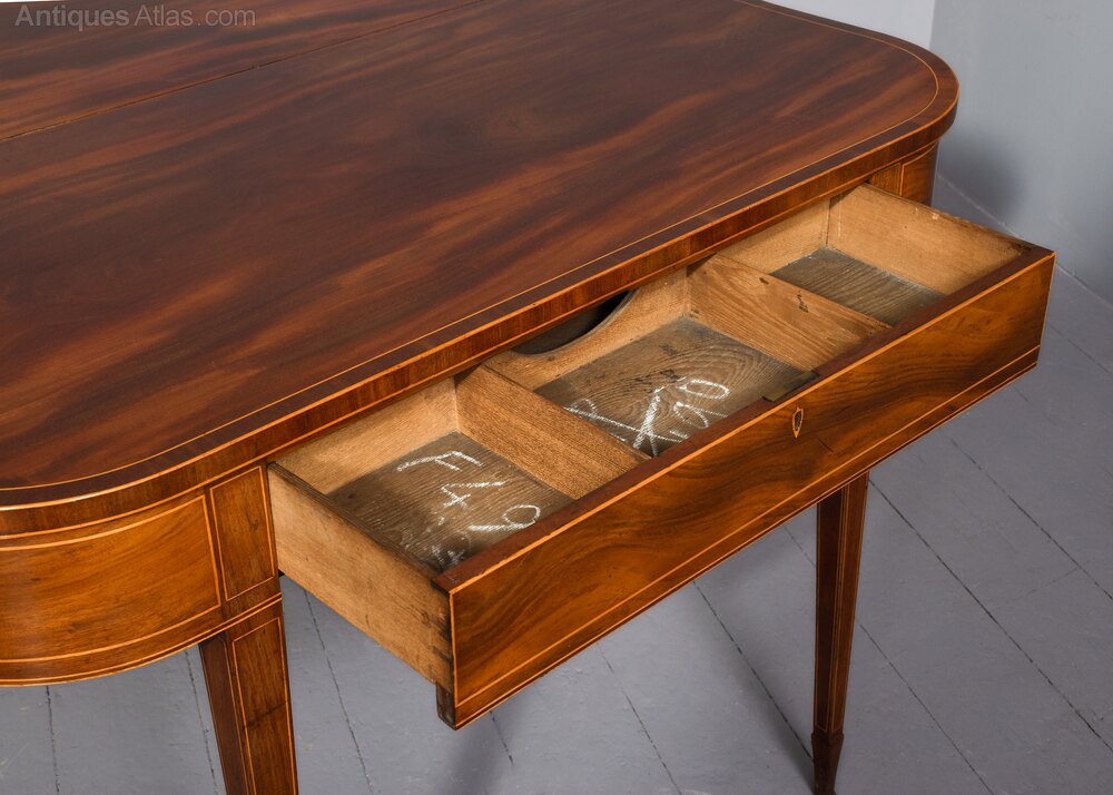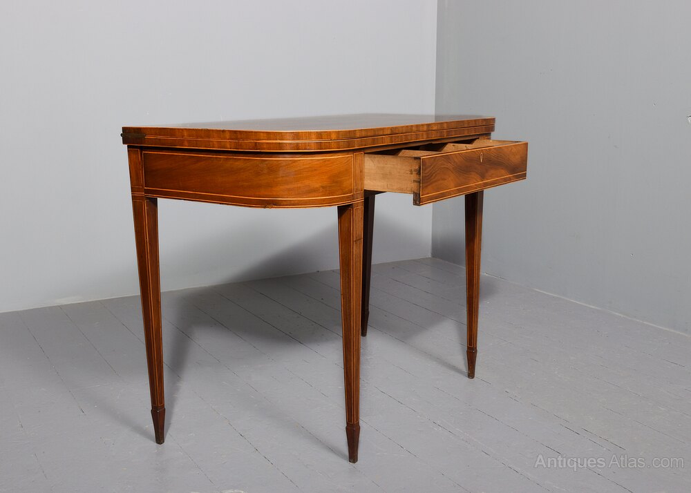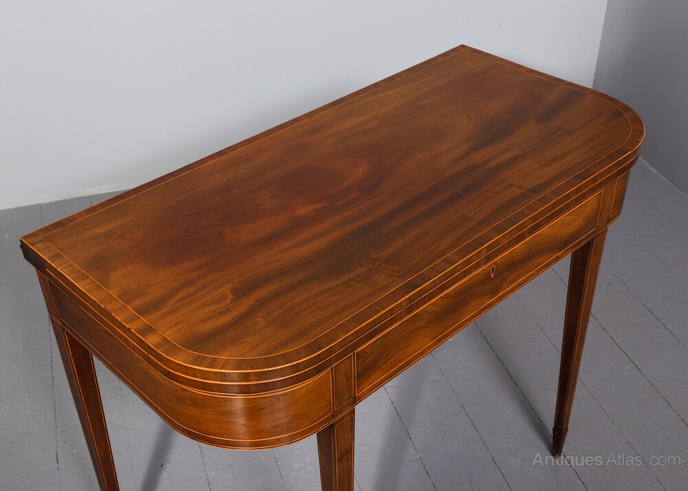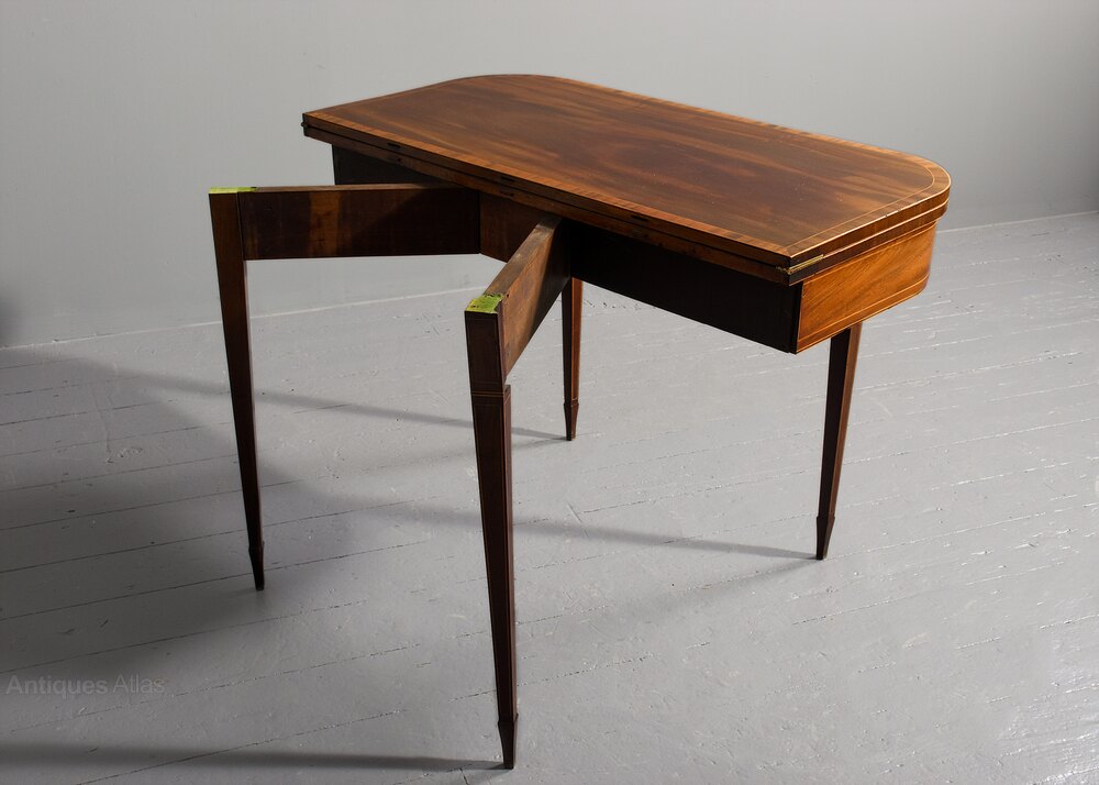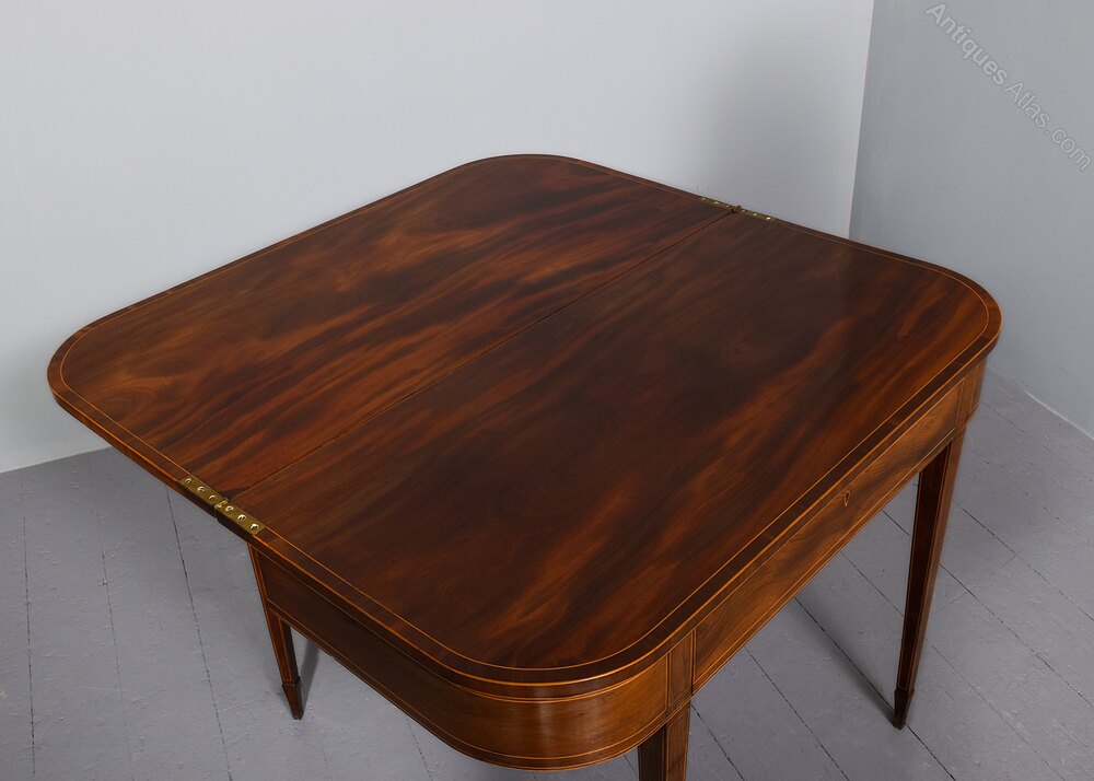 Circa 1800. A late George III mahogany and inlaid fold over tea table, the D shaped top in a wonderful flame mahogany with boxwood string inlay and banding, the hinged top opens to reveal the inside in wonderful un-faded rich mahogany with the brass hinges exposed, the frieze with a full-length drawer in fine mahogany, the inside of the drawer is fitted out and lined in ash, indicating that it could be Scottish, the table rests on four square tapering and inlaid legs, back legs are hinged and swing out to support the top when open, and all finishing on extended spade toes.