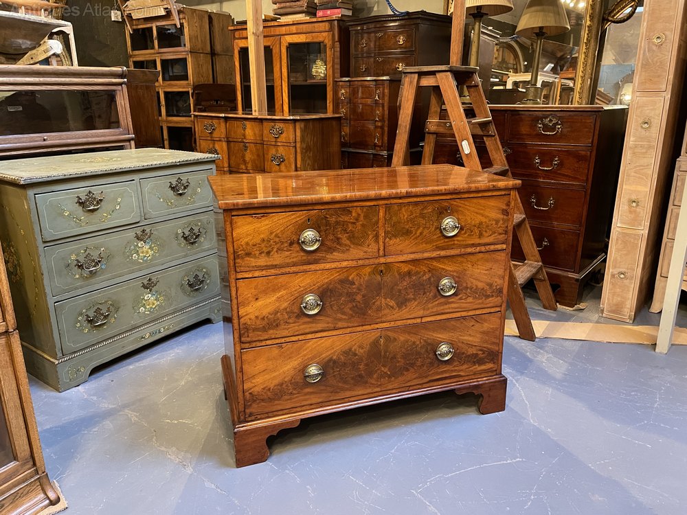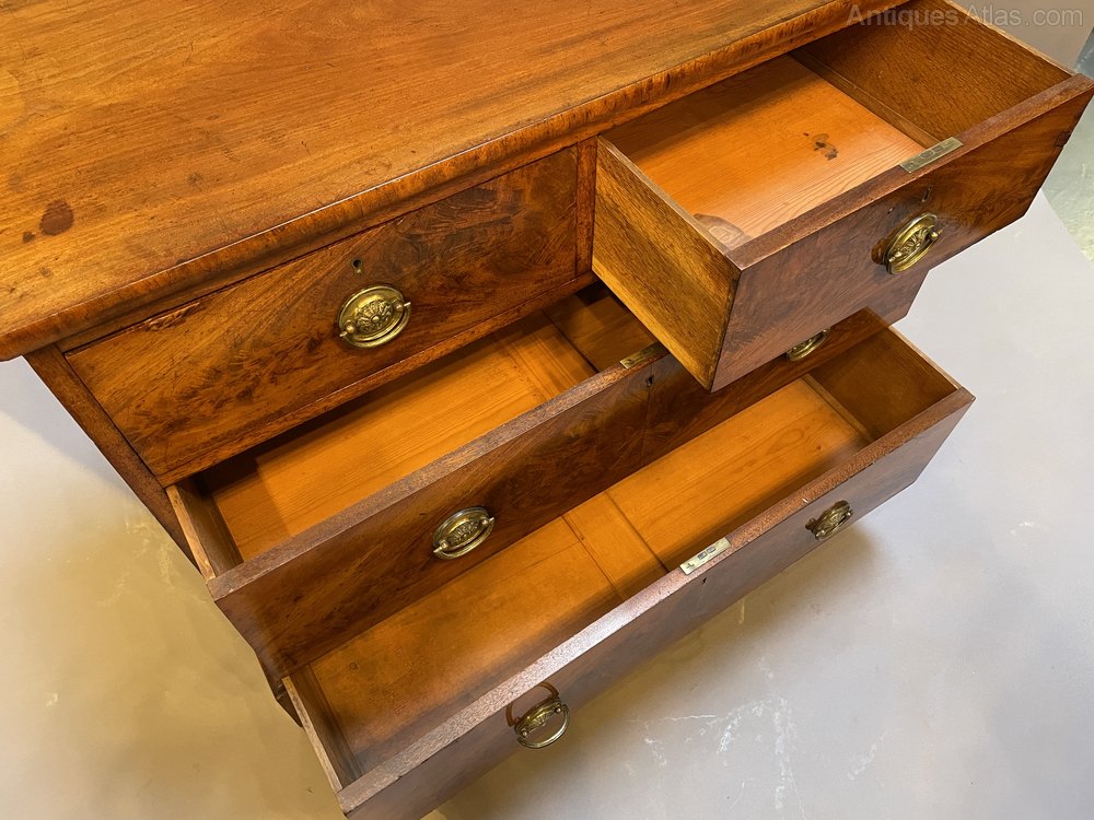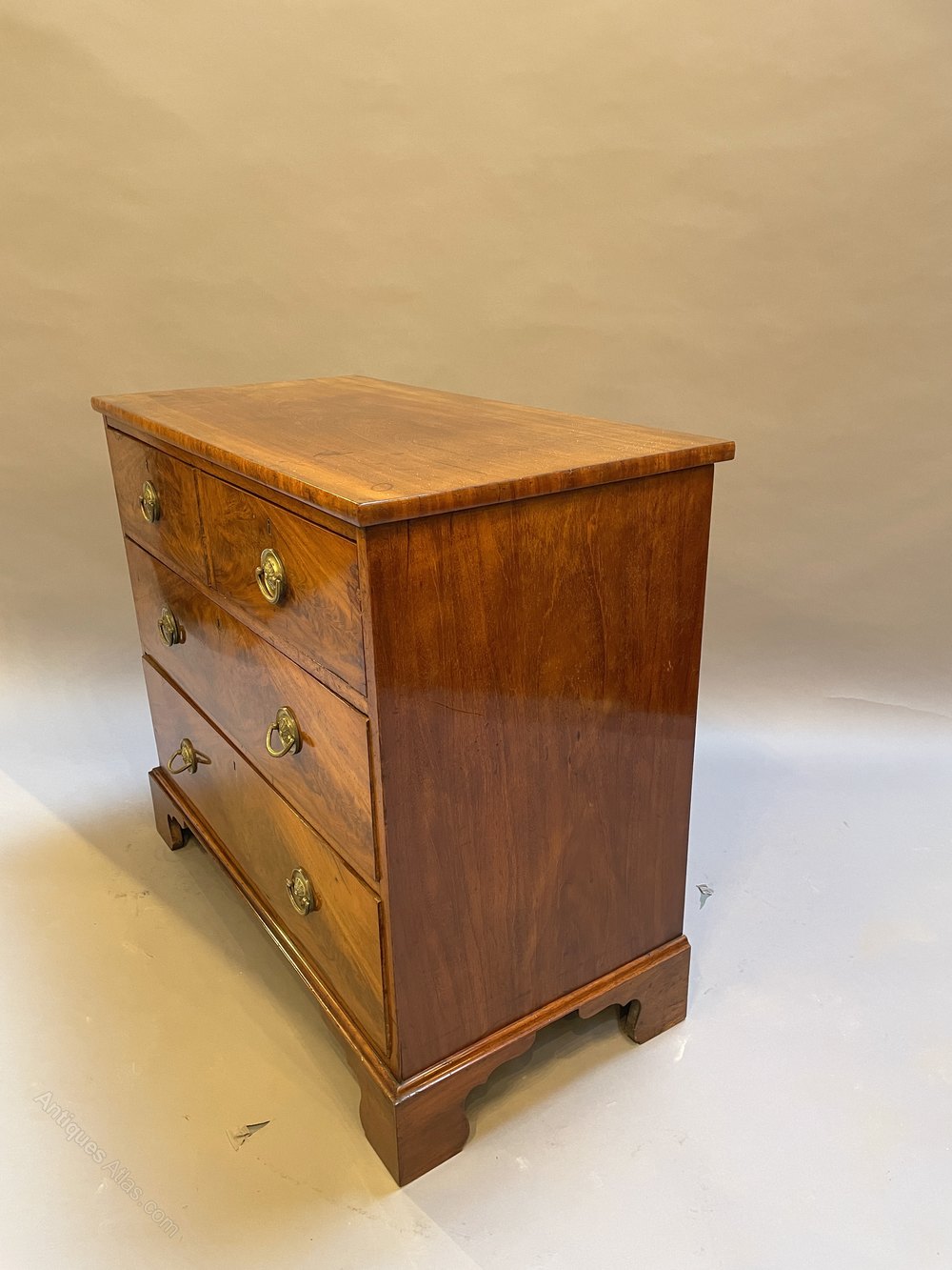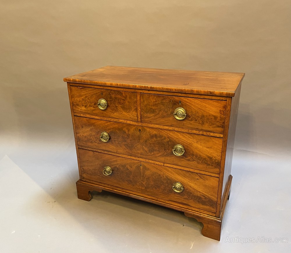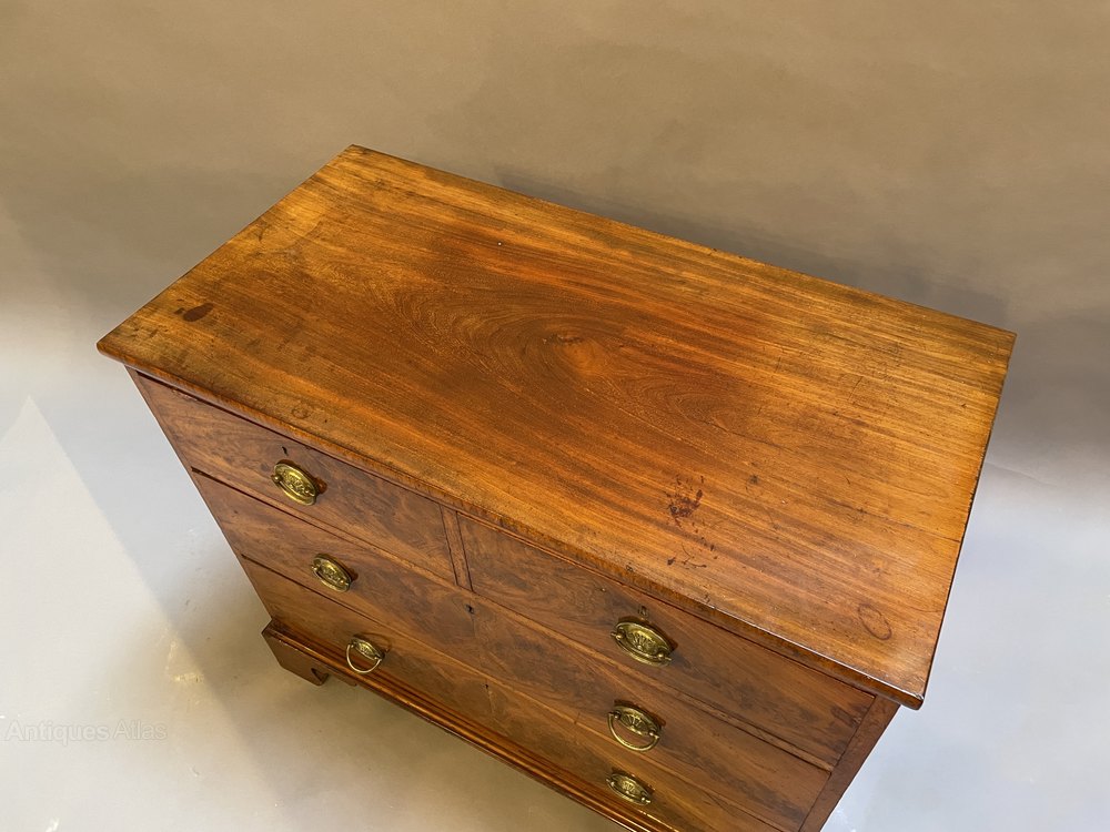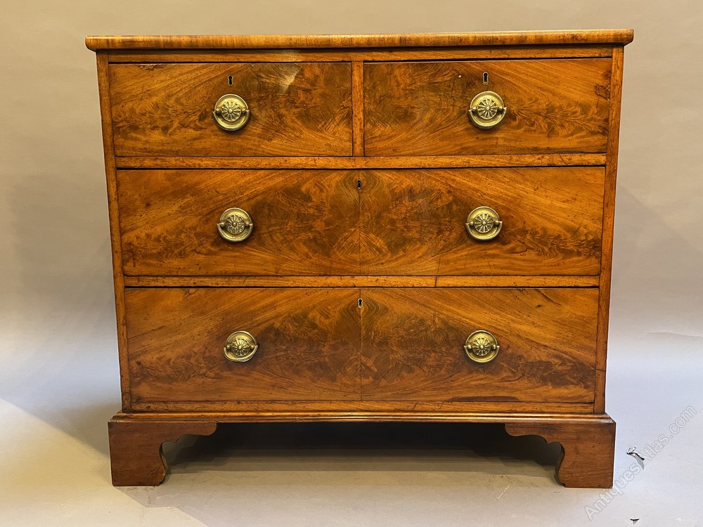 early C19th flame figured mahogany of 2 short over 2 long drawers with gilt ring-pull handles and raised on bracket feet.