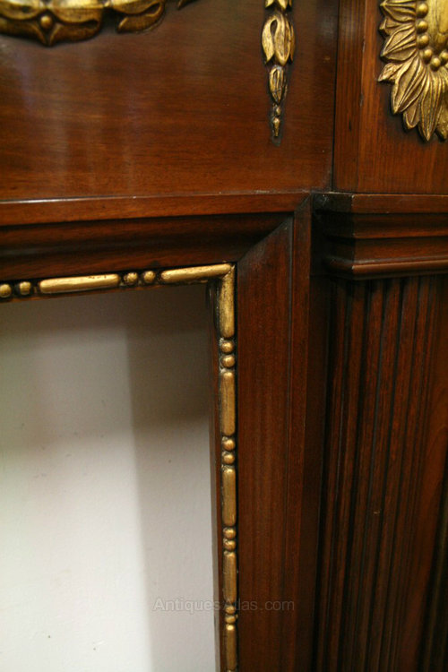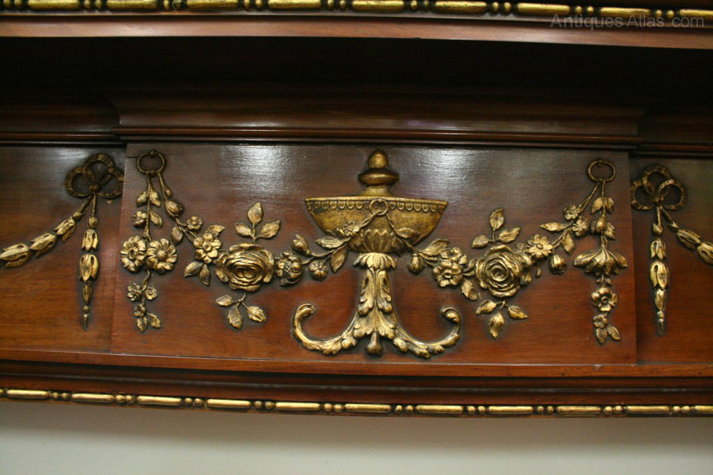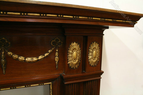 Circa 1900, George III style mahogany fire surround, decorated with various gilded gesso panels and beadings in the classical Adams style with urns, swags and tails. There are two curved and fluted pilasters on both sides. The mantelpiece has excellent colour and condition.