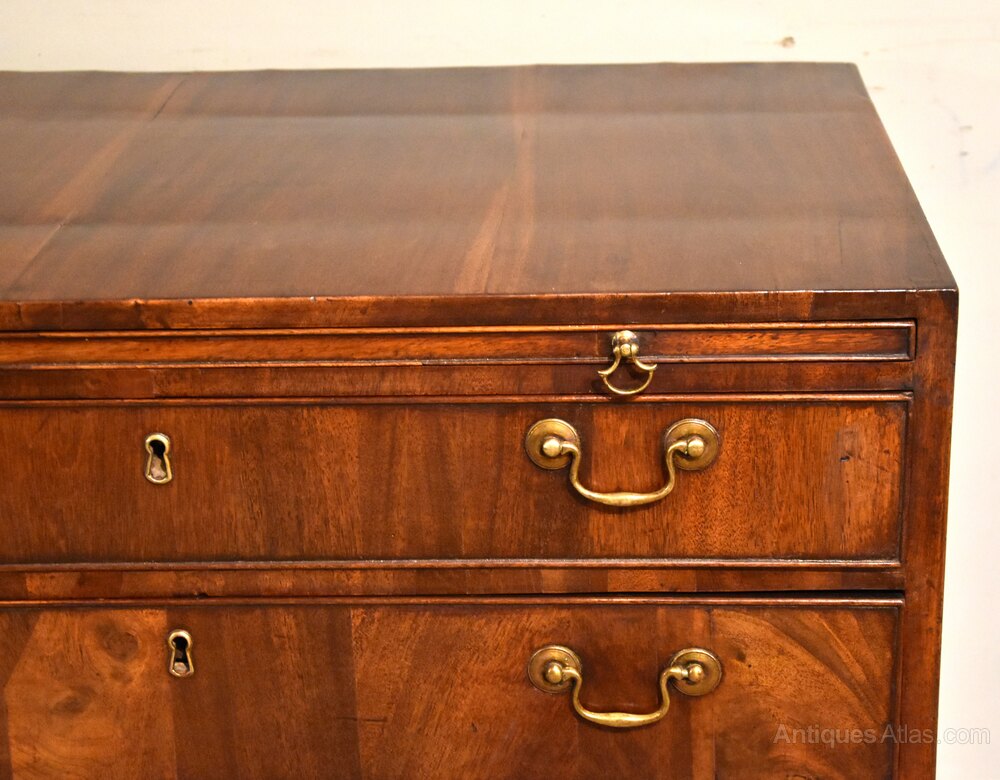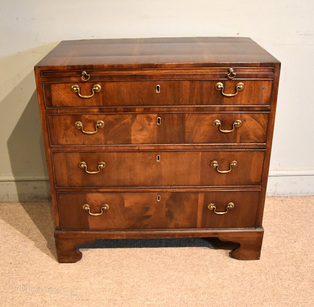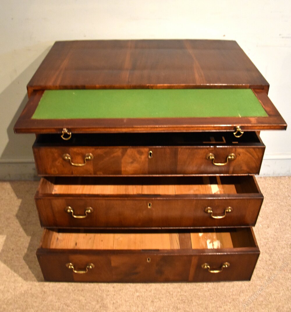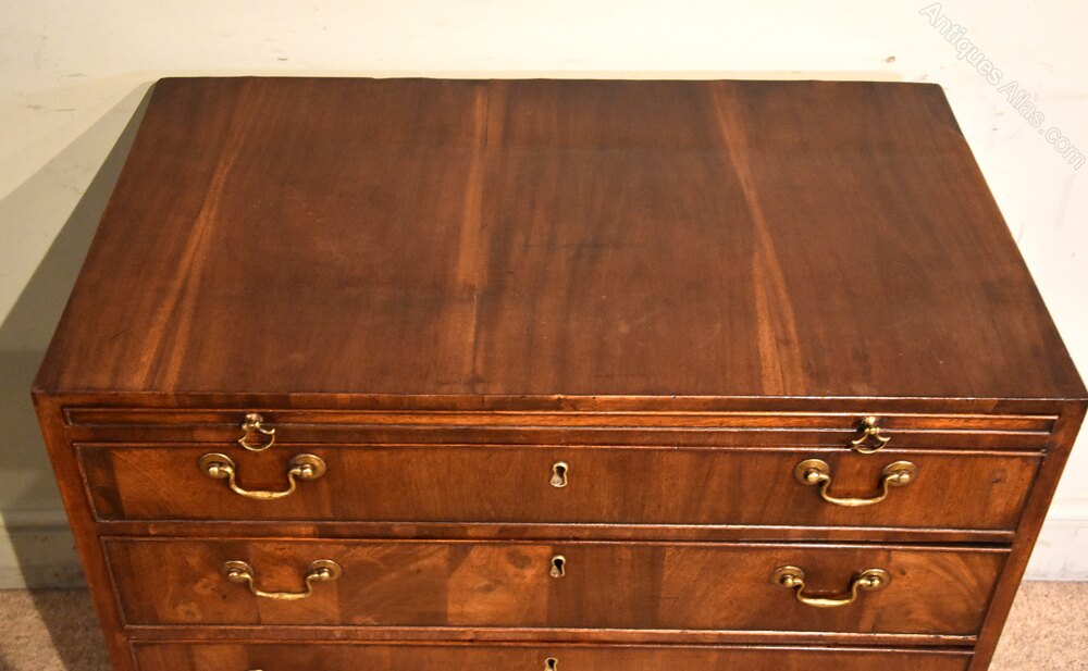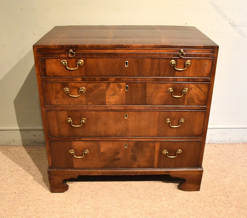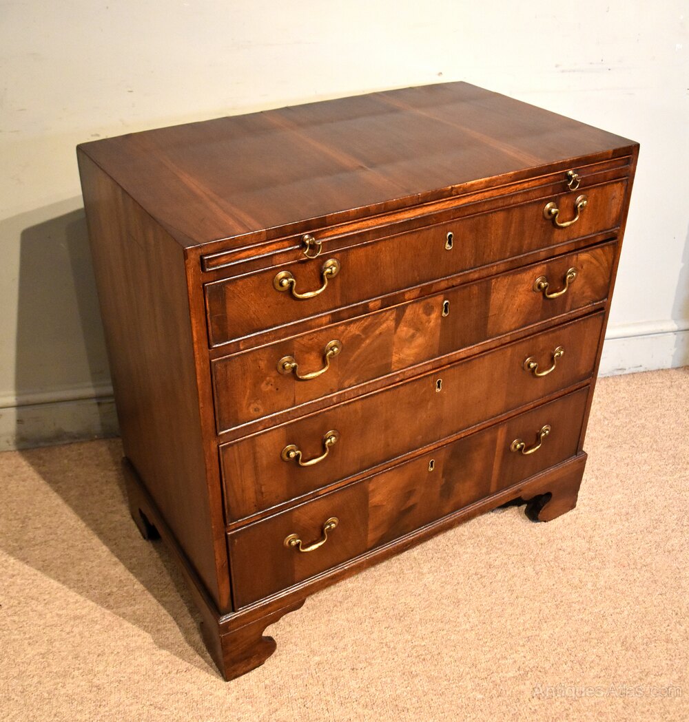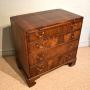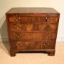 A super early George III Virginia walnut veneered chest of drawers of small ropotions under 20" wide. Wonderful colour and patina with original condition throughout and swan neck handles, brushing slide below the caddy top as well as unusual front to back veneers.