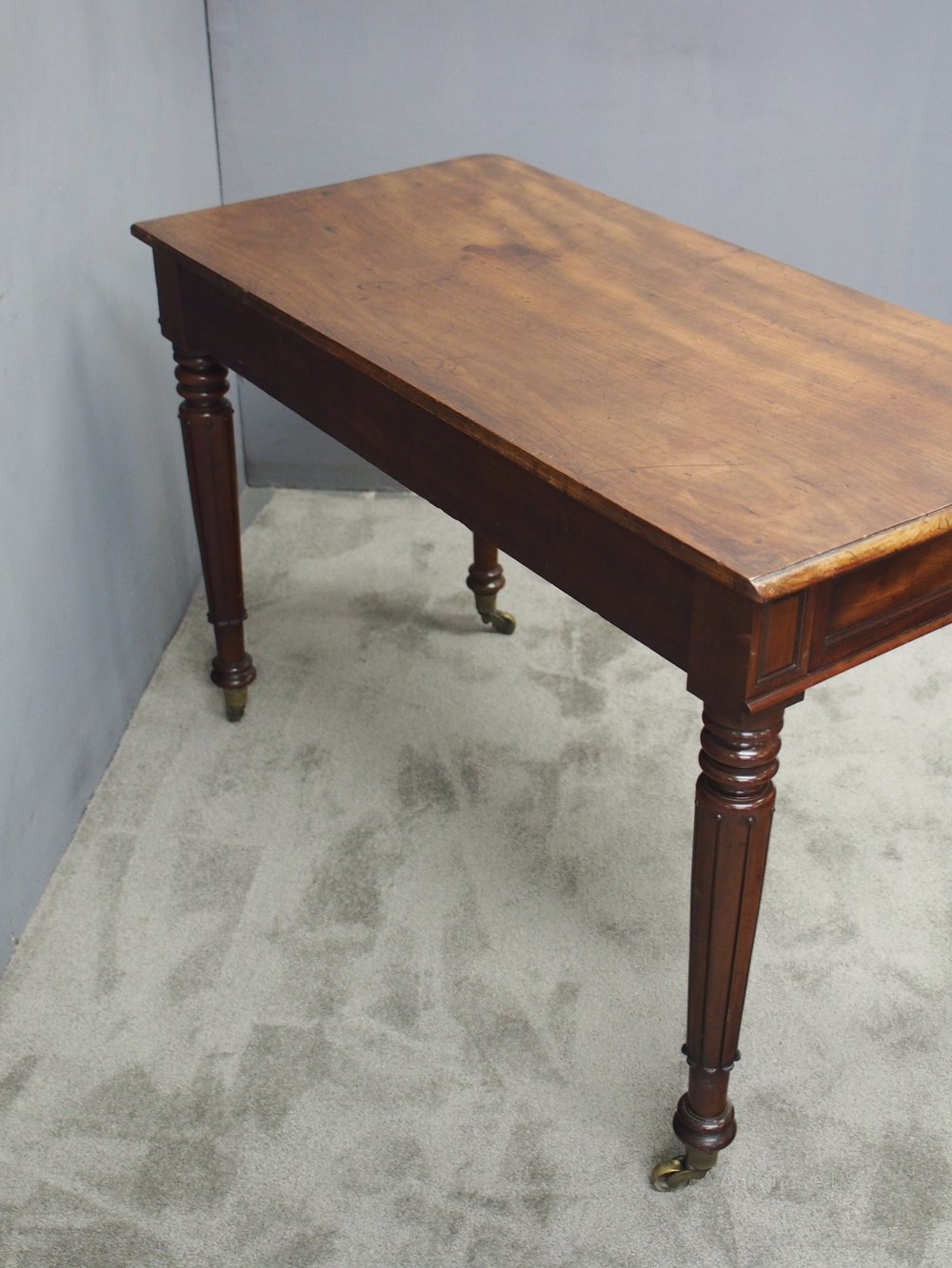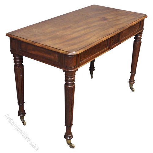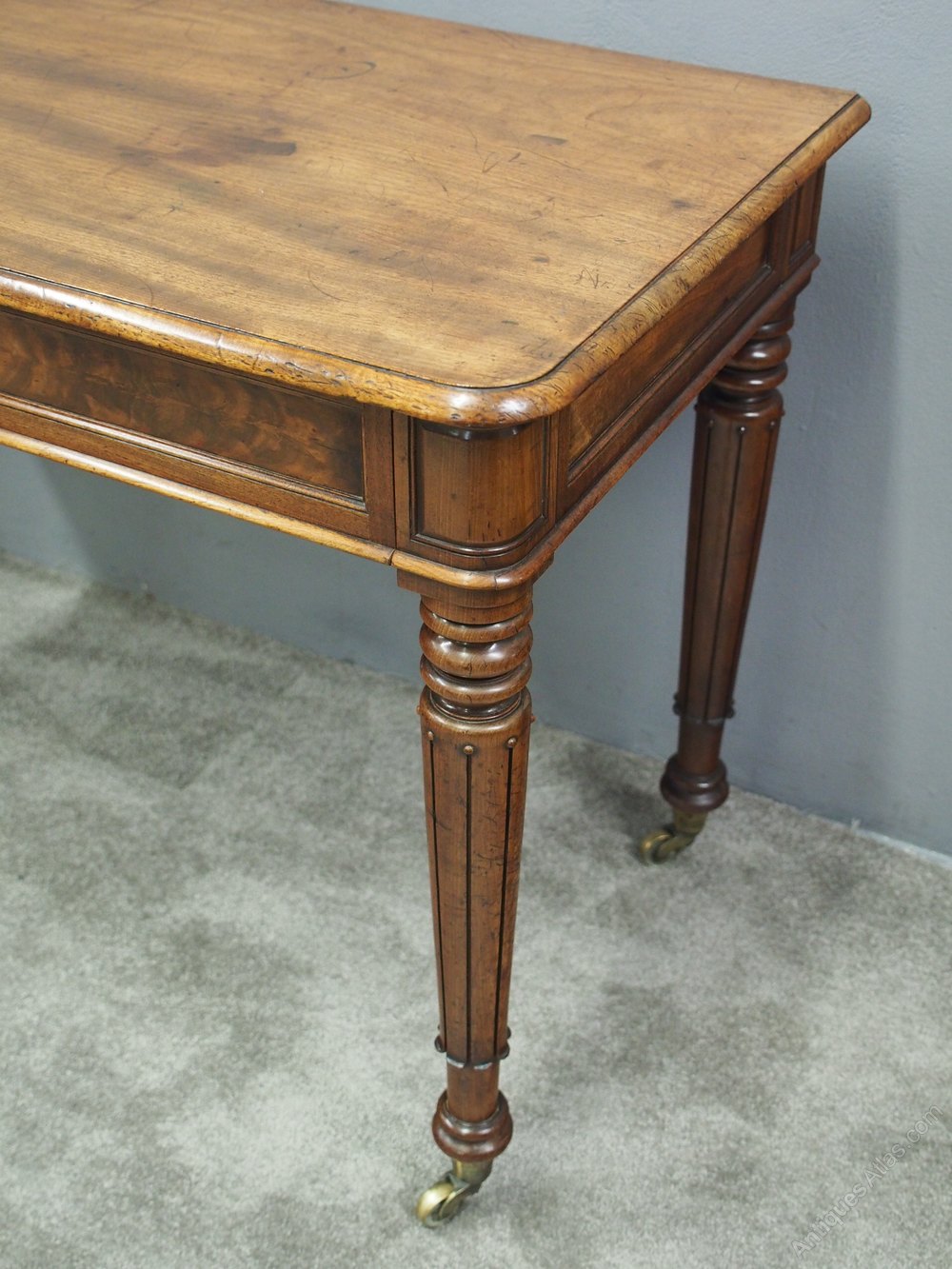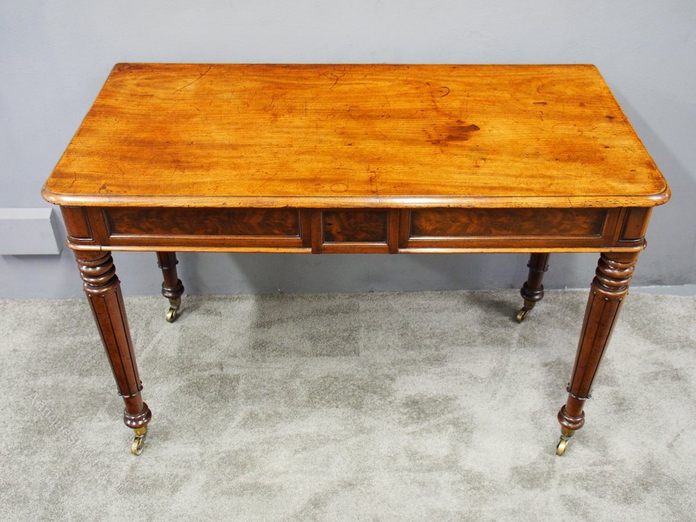 Circa 1820, George IV mahogany side table. With well figured top, rounded corners to the front with moulded edges, over flame mahogany panelled drawers. All on turned, ring turned, tapering and reeded legs on substantial cast brass cups and castors.