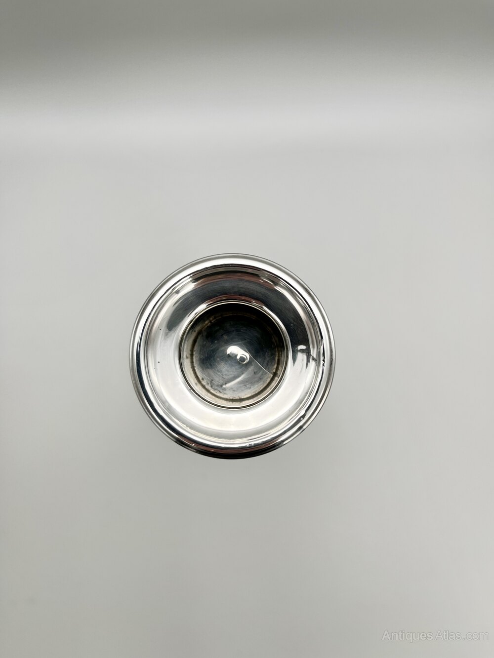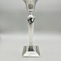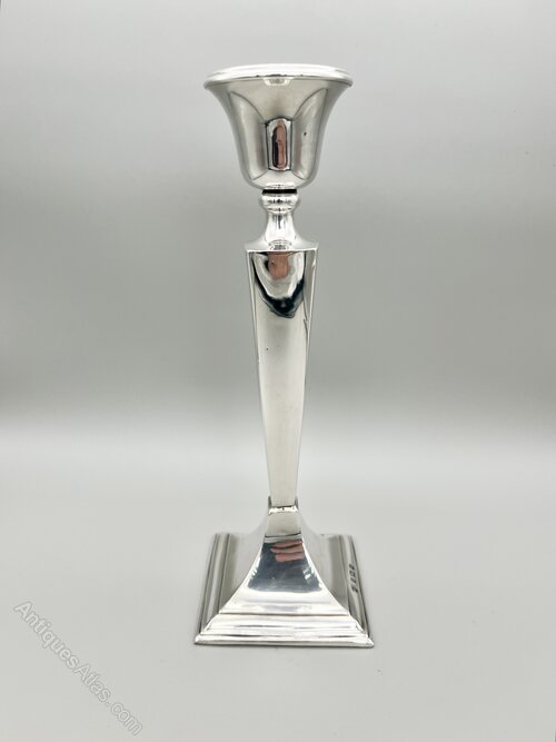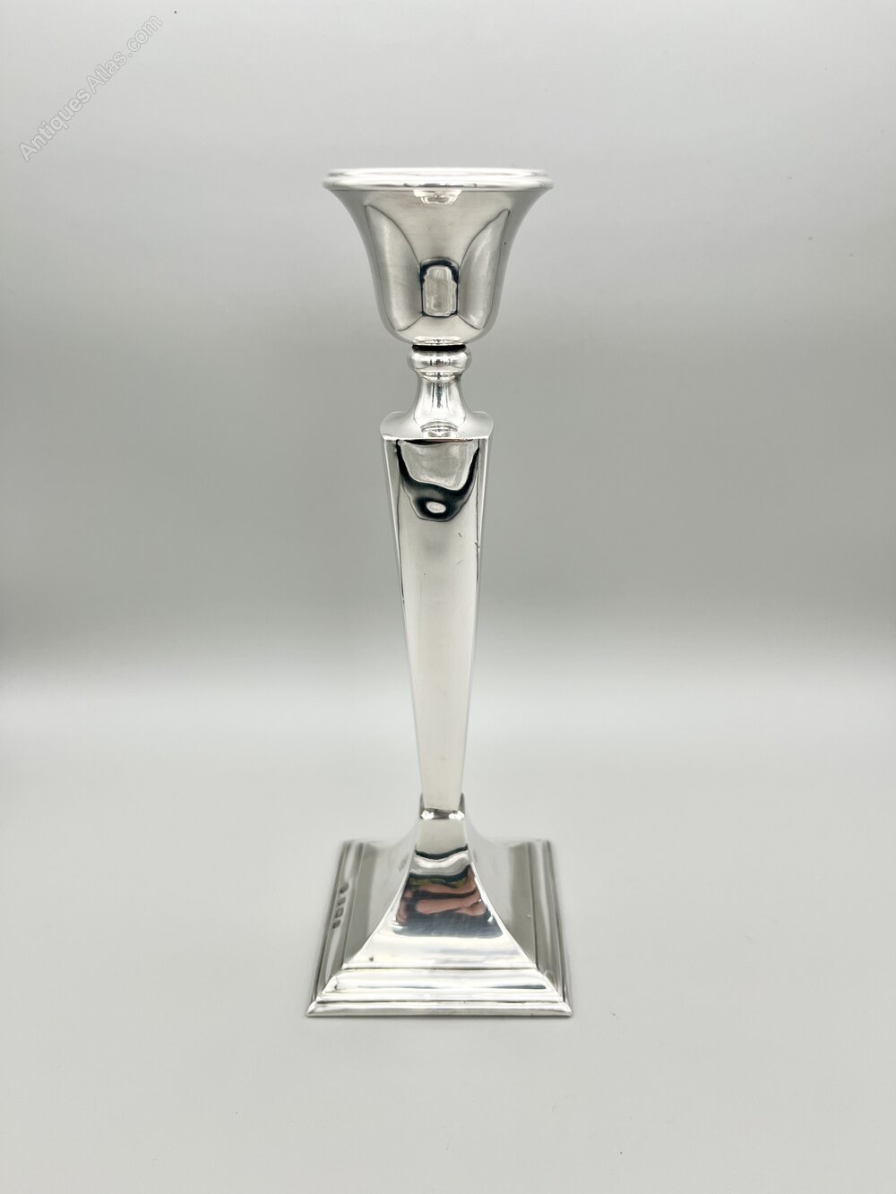 This is a handsome George V Sterling Silver Candlestick. The stick has a square stepped base, weighted for stability, curving in as it rises to the bottom of the stem. The square stem tapers outwards and is surmounted by an urn shaped sconce. There are no initials or personalisation of any kind.