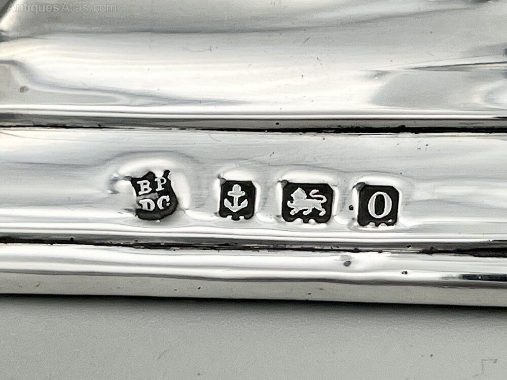 The hallmarks, on the upper side of the base, are nice and clear to read. They show the lion passant for Sterling Silver, the anchor assay mark for Birmingham, the date letter o for 1913 and the B P D C in a shield makers' mark for Boots Pure Drug Co.