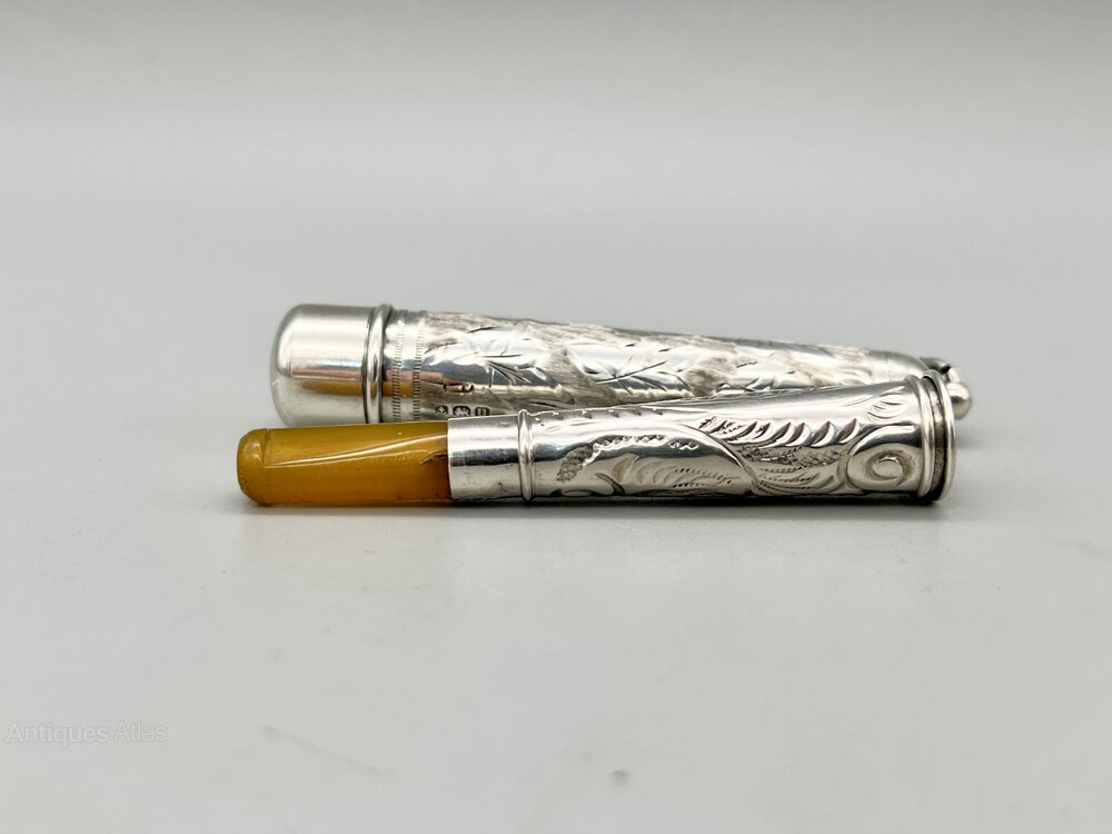 This is a stylish George V Sterling Silver Cigarette Holder with an Amber mouthpiece complete with its original case. The holder is decorated with scrolls and foliage and the outside of the case with textured foliage. There are no initials or personalisation of any kind.