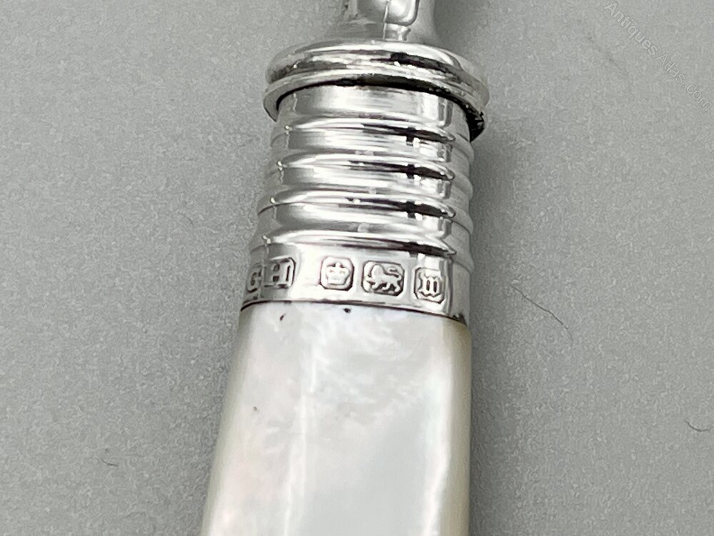 The hallmarks, on the ferrules or collars of the nut picks, are well struck and clear to read. They show the lion passant for Sterling Silver, the crown assay mark for Sheffield, the date letter w for 1914 on one and g for 1924 on the other and the G H makers' mark for George Howson of Harrison Brothers & Howson.