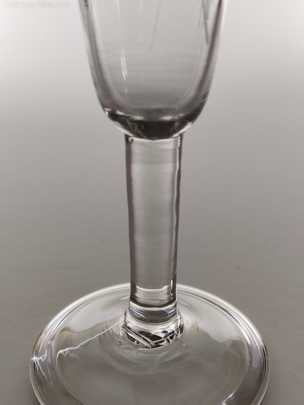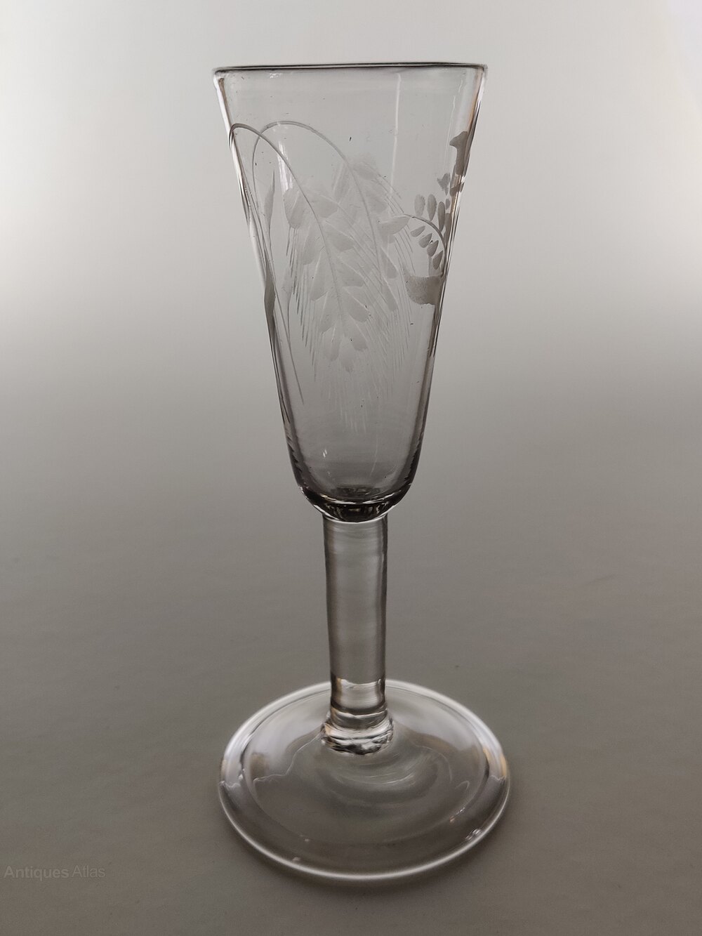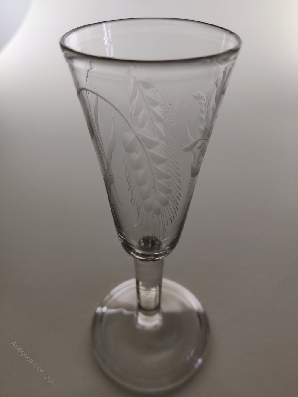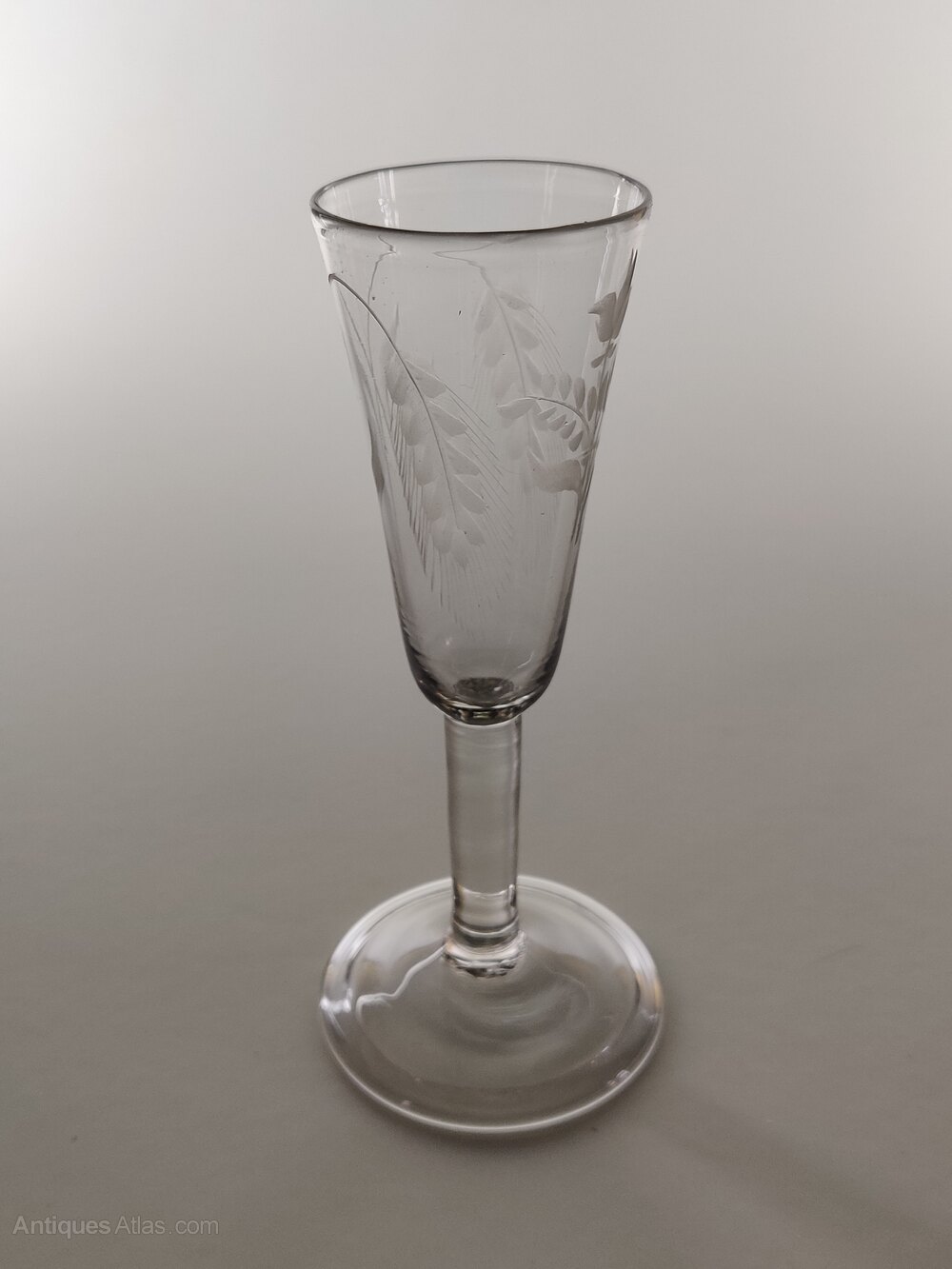 A delightful Georgian Ale glass with folded conical foot, plain stem and beautifully extended funnel shaped bowl, engraved with barley in saltire with rough pontil.