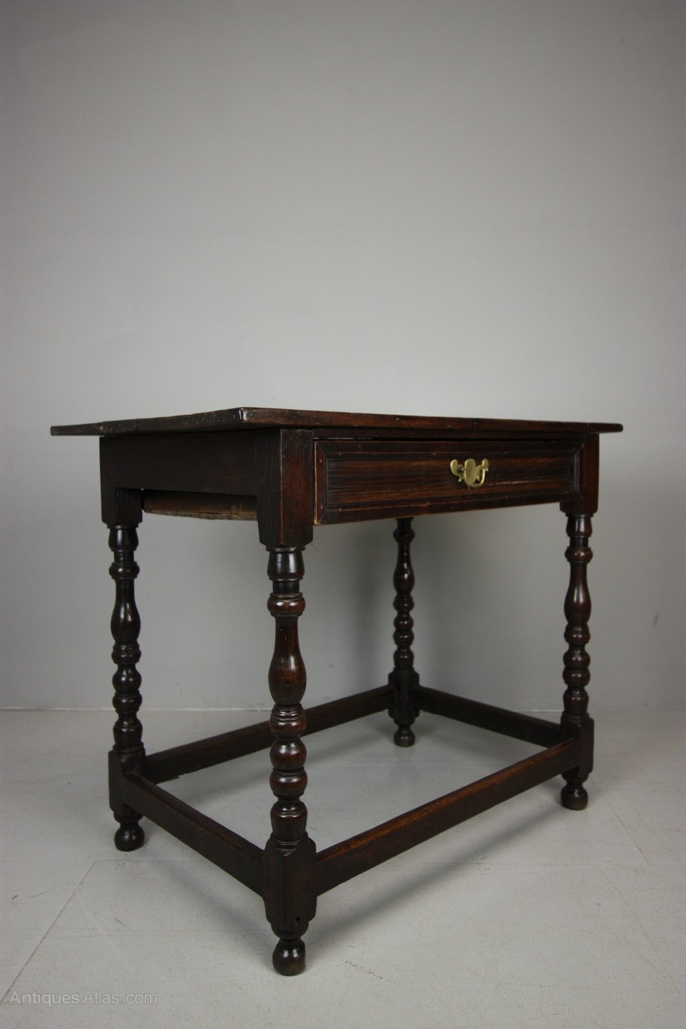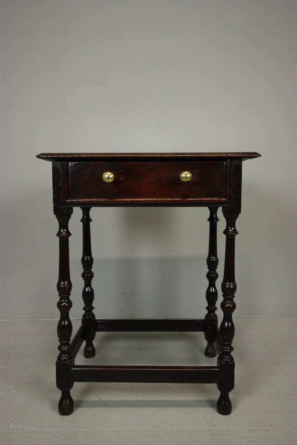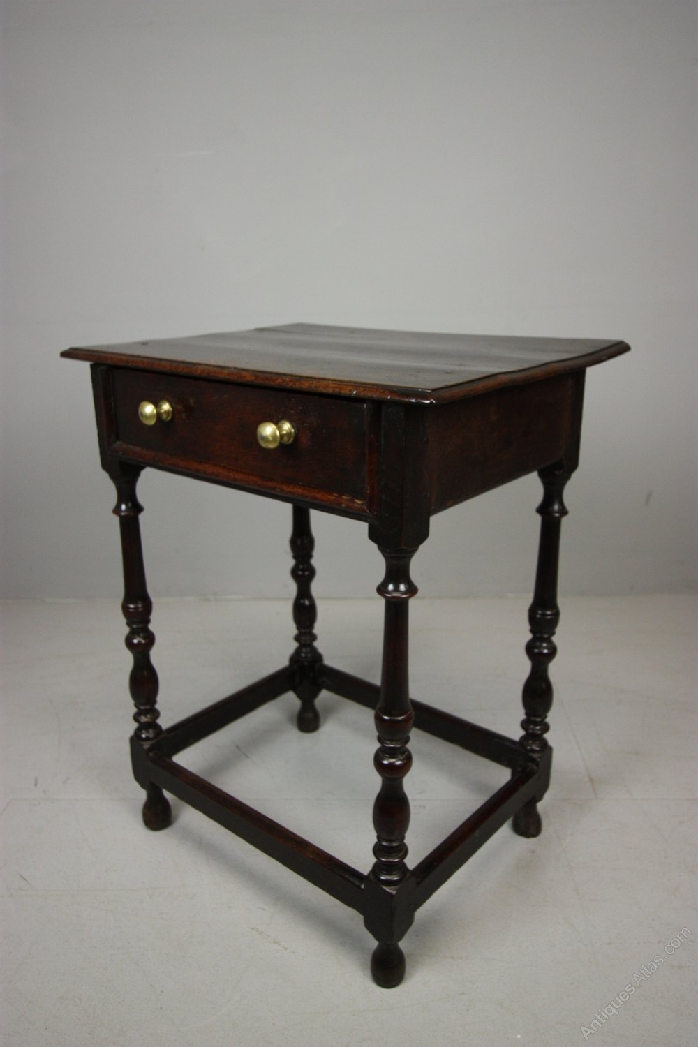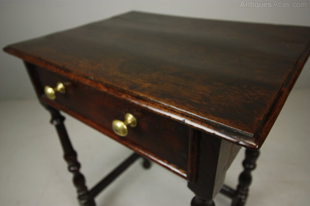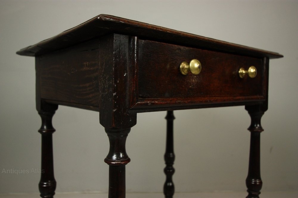 Georgian Antique Oak Smaller than Usual Side Table. This is a delightful, unusually smaller than usual, 18th century, English period oak side table. In great condition, all very original and a good colour. The Georgian antique oak side table stands on turned legs with a square, stretcher base. All pegged construction, the oak top is moulded as is the drawer which has period brass handles. Dating from around 1750-60, a beautiful small period oak side table.
