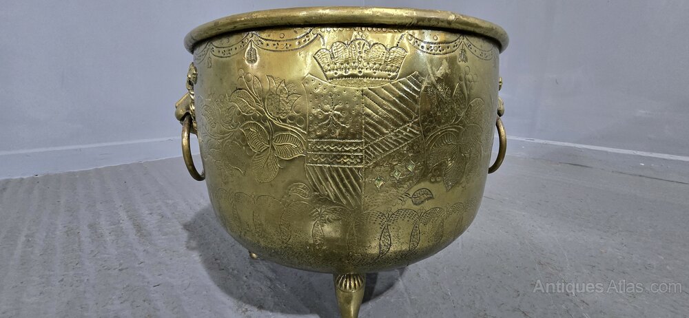 A very nice Georgian style brass log bi, engraved armorial crests to both sides, with lion mask carrying handles.