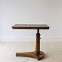 These antique tables were conceived for the library or study, allowing a gentleman or lady to read, annotate and write letters from a fireside chair. The offset platform foot and height adjustment make it possible to draw the top comfortably over the lap, while the flat section provides space for inkwells or notes beside an open book.
