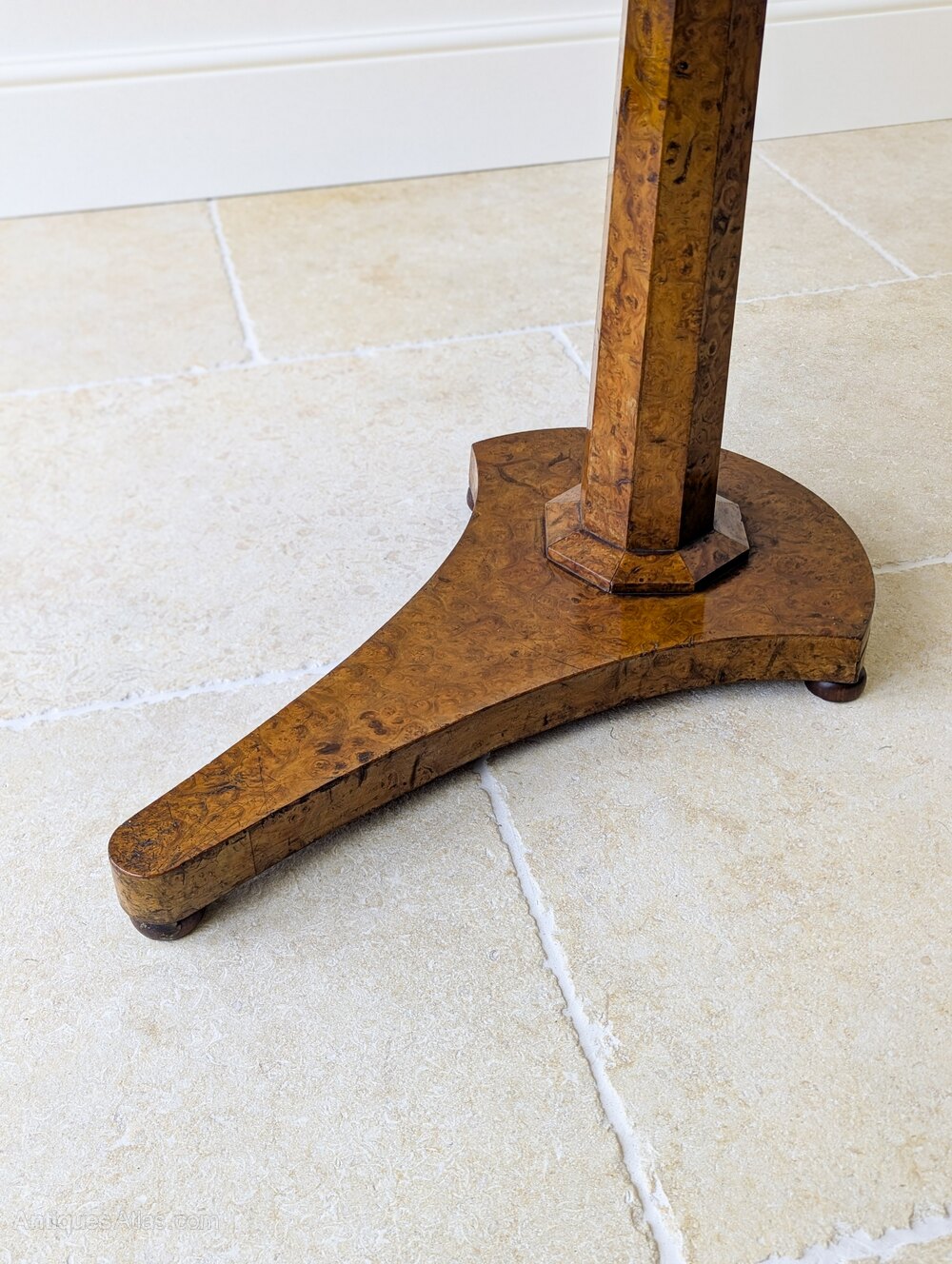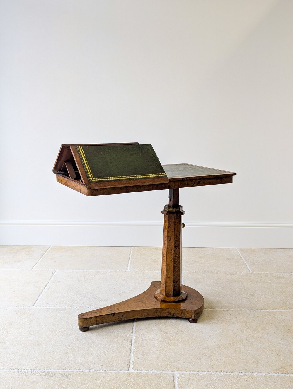 The height of the table is adjusted by a brass pin, the inner shaft of oak sliding within the burr elm–veneered octagonal column, all raised on a shaped platform base designed to slide neatly beneath the sitter’s chair.