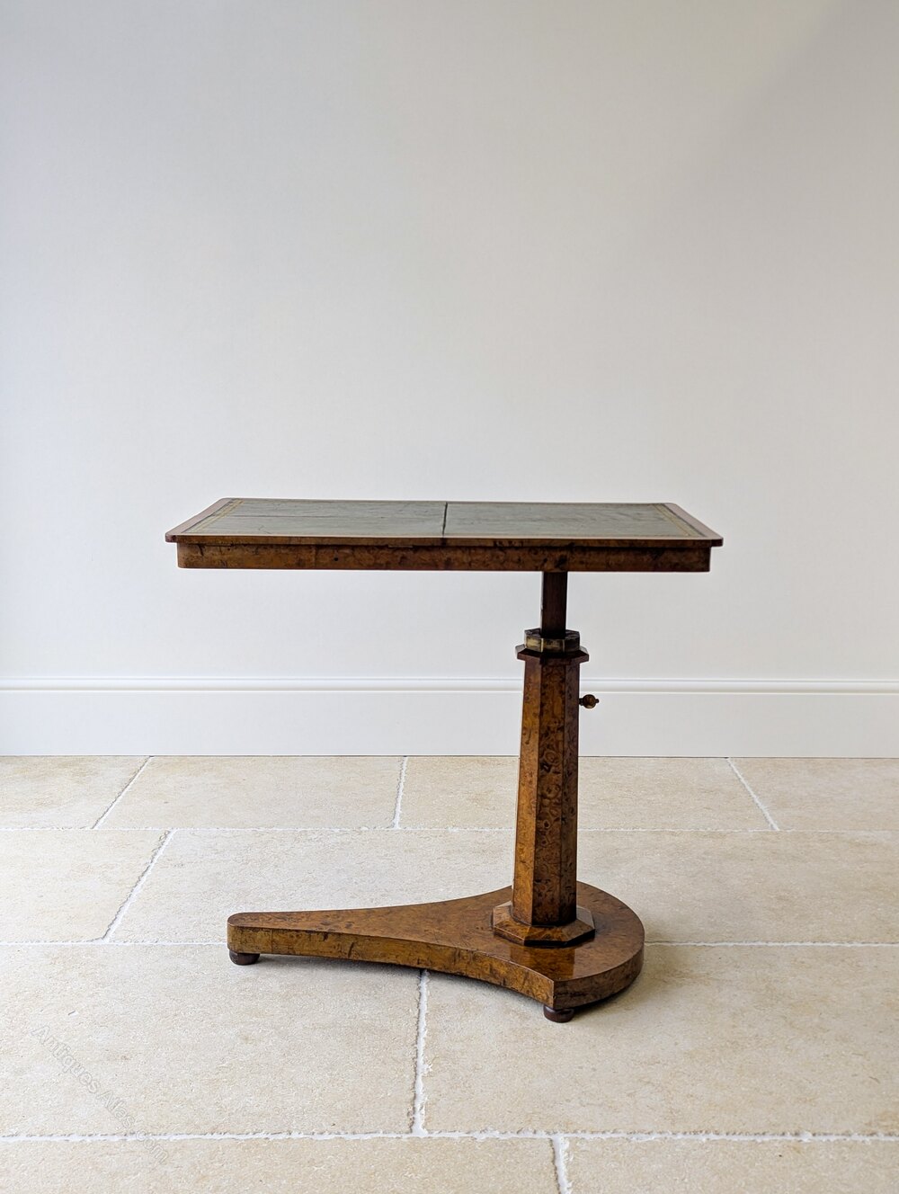 Presented in very good antique condition, with excellent burr elm figuring, a warm polished finish and later but very well-executed replacement leather. The brass and oak mechanism operate smoothly, and the table stands firm and level. Structurally sound, clean and ready to place in the home.