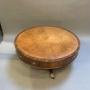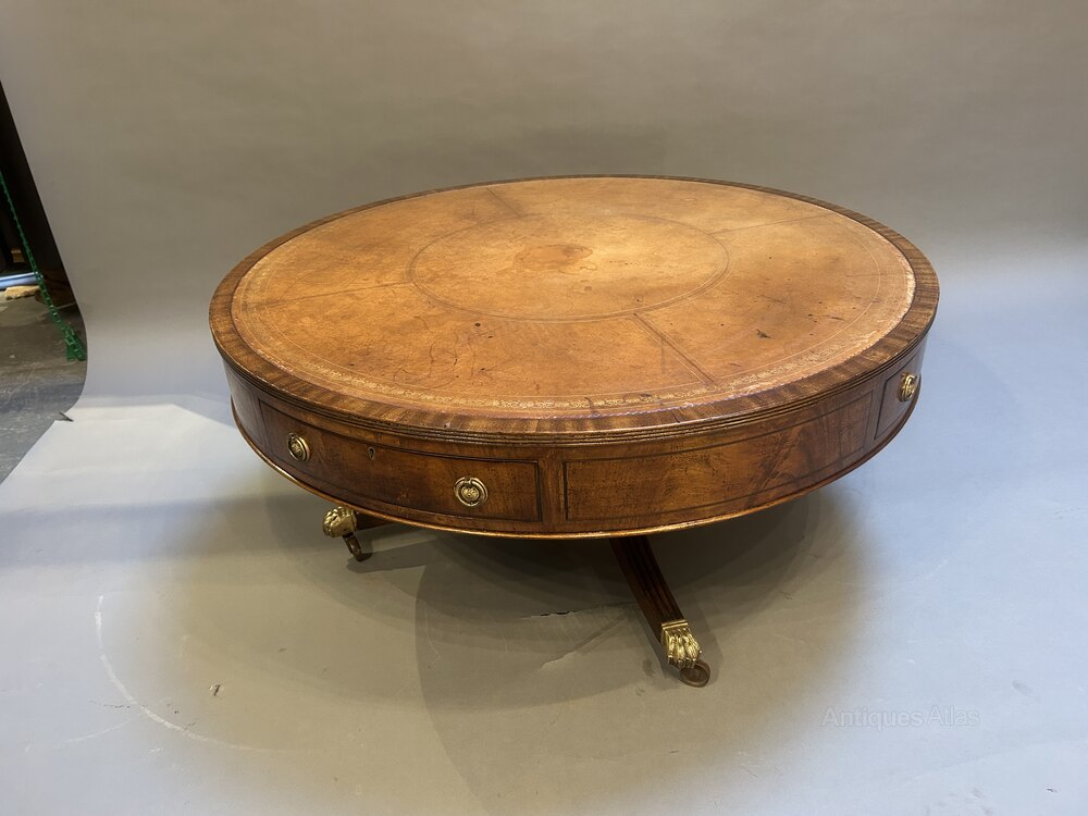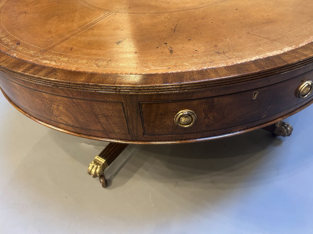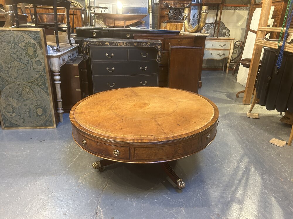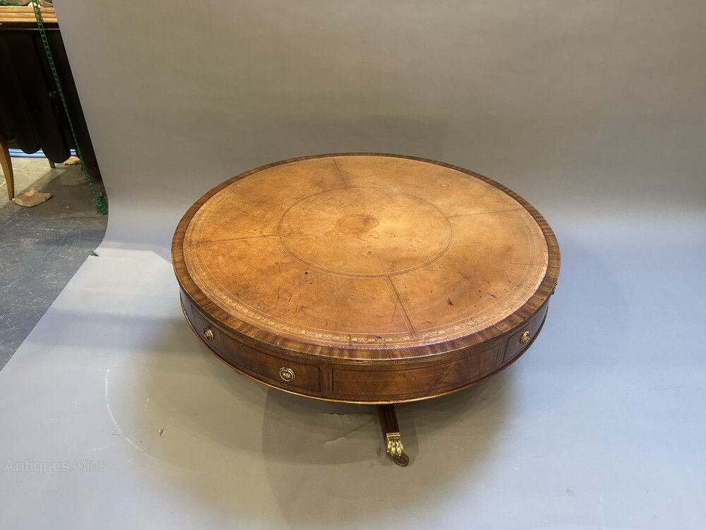 In the Georgian taste, figured mahogany inset with leather lining , the deep frieze fitted 4 drawers with ring pull handles raised on (adapted) quatraform base of 4 swept legs to brass castors.