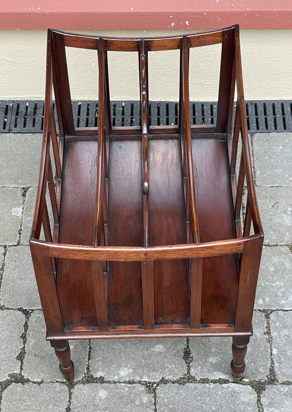 A good George III mahogany and ebony banded Canterbury / magazine rack of large proportions with beautiful shaped handle and finely turned and tapering legs, terminating in brass castors. Circa 1810 - 1815. Unusual to see without a drawer. An elegant piece in superb original condition and great colour, cleaned and waxed.