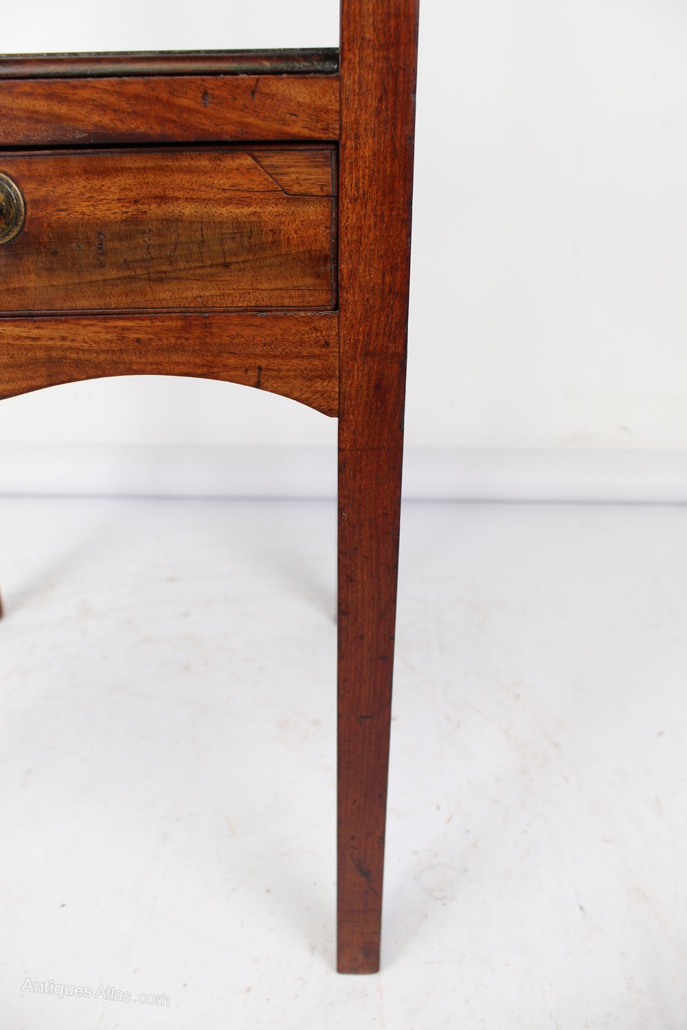 A handsome small antique Georgian mahogany night stand or bedside table with drawer dating from circa 1800. It features a solid top over an open shelf above a single frieze drawer with brass pull handle and stands on four elegant square legs. With wonderful colour and original patina and splendid figuring to the mahogany. A really good quality piece that would work equally well as a bedside cabinet as it would next to a desk or as a lamp table.