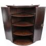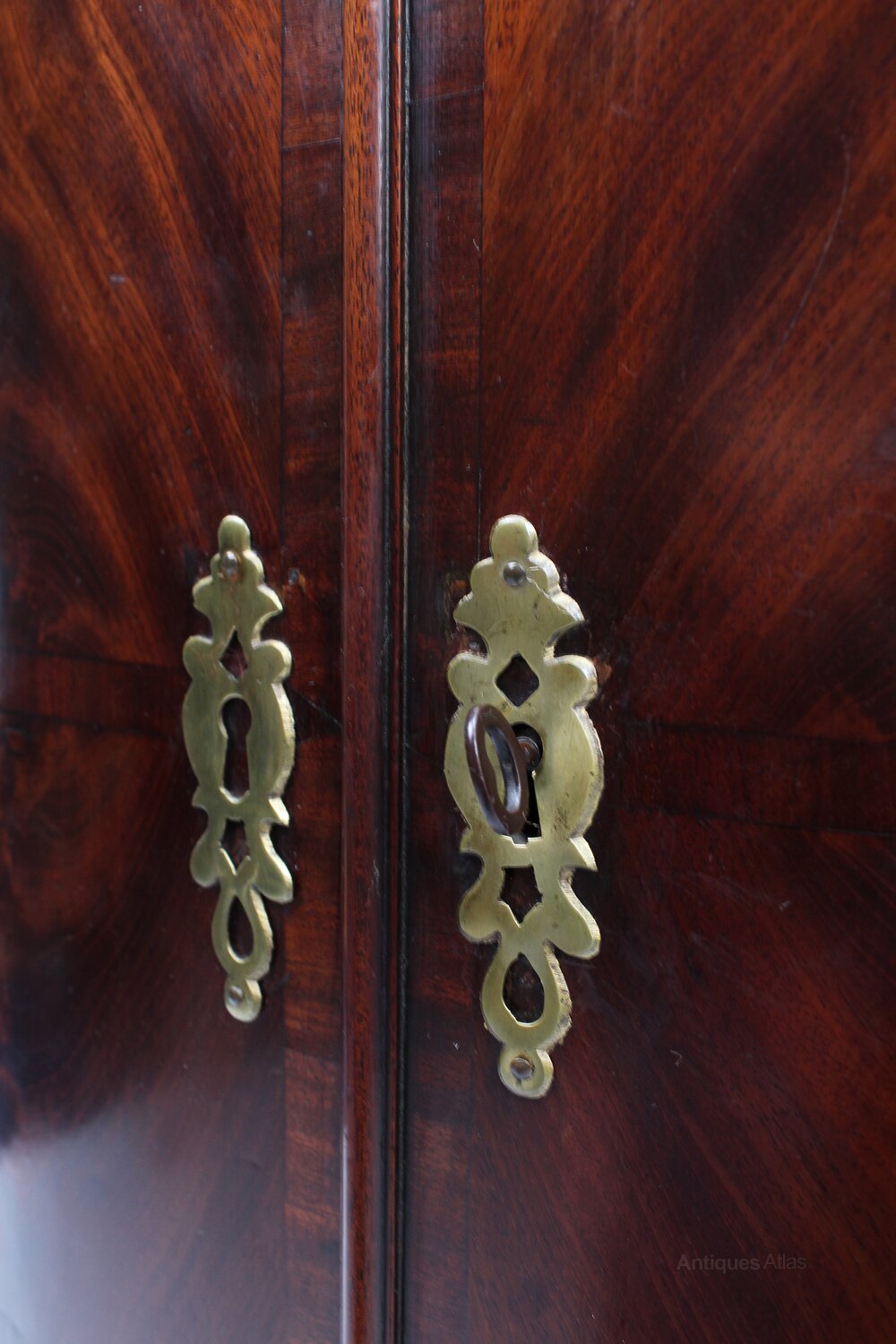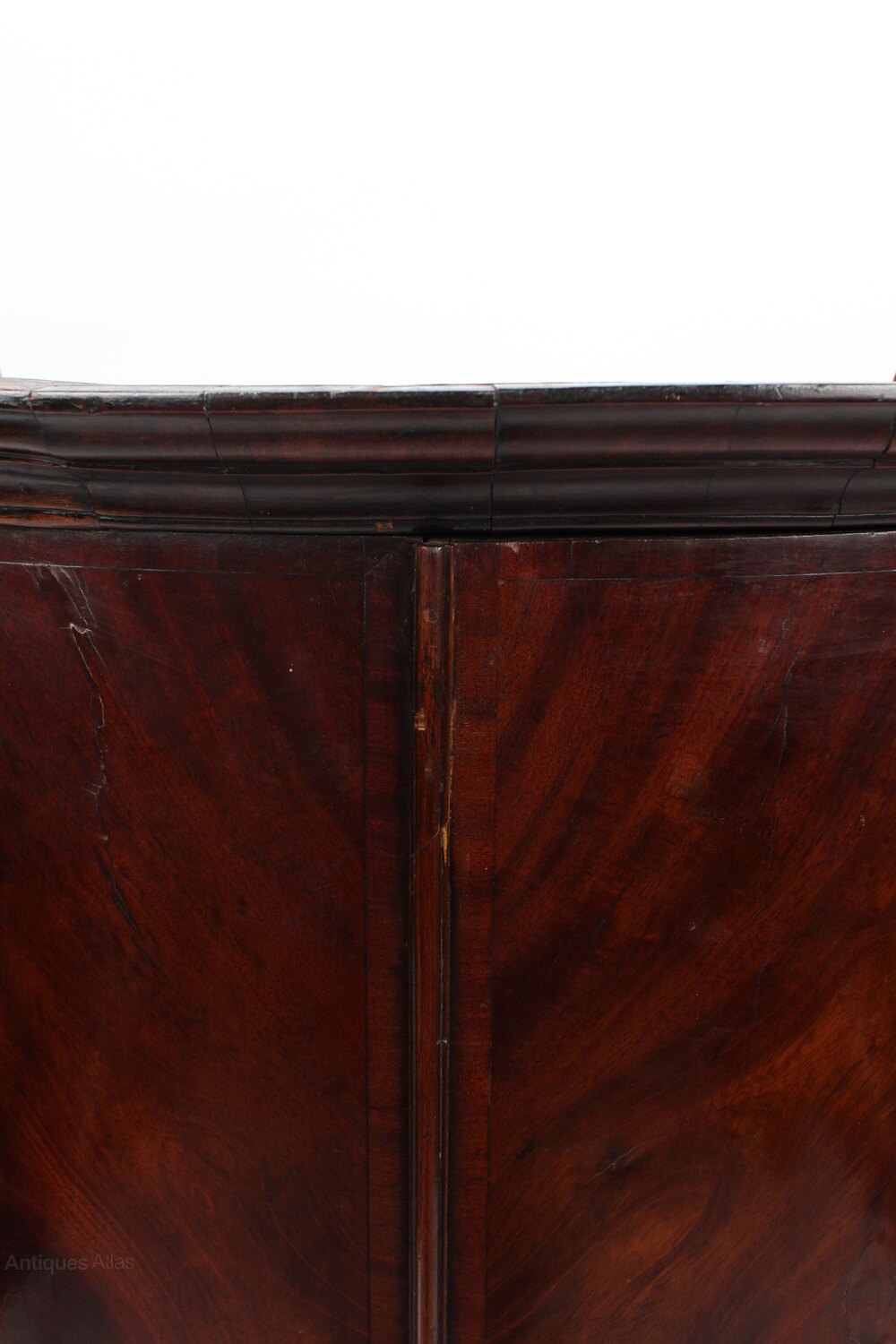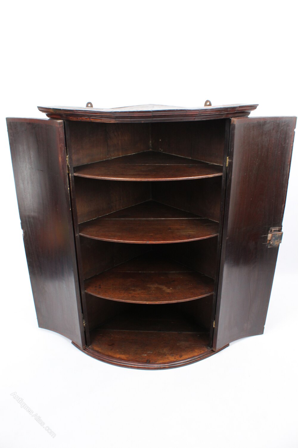 A magnificent antique George III mahogany bow fronted corner hanging cupboard dating from circa 1800. Having a moulded cornice above two doors, which open to reveal storage inside the interior fitted with three shelves, with working lock and key. The doors have ‘H’ brass hinges and an attractive escutcheons. A wonderful deep colour with beautiful figuring and patina. complete with hanging brackets.