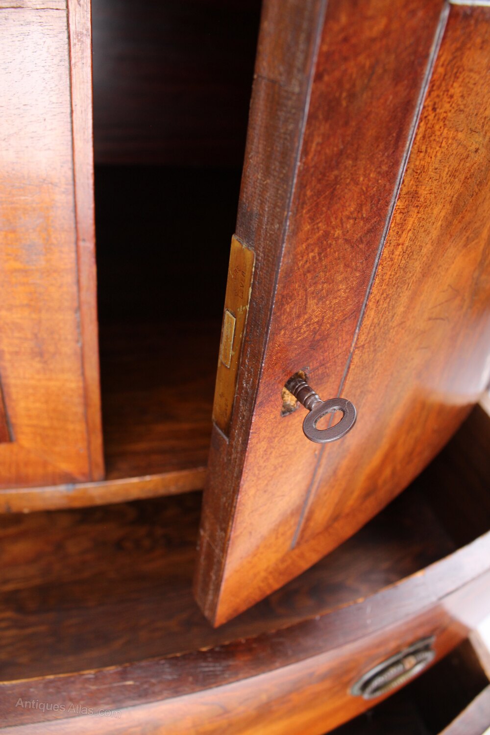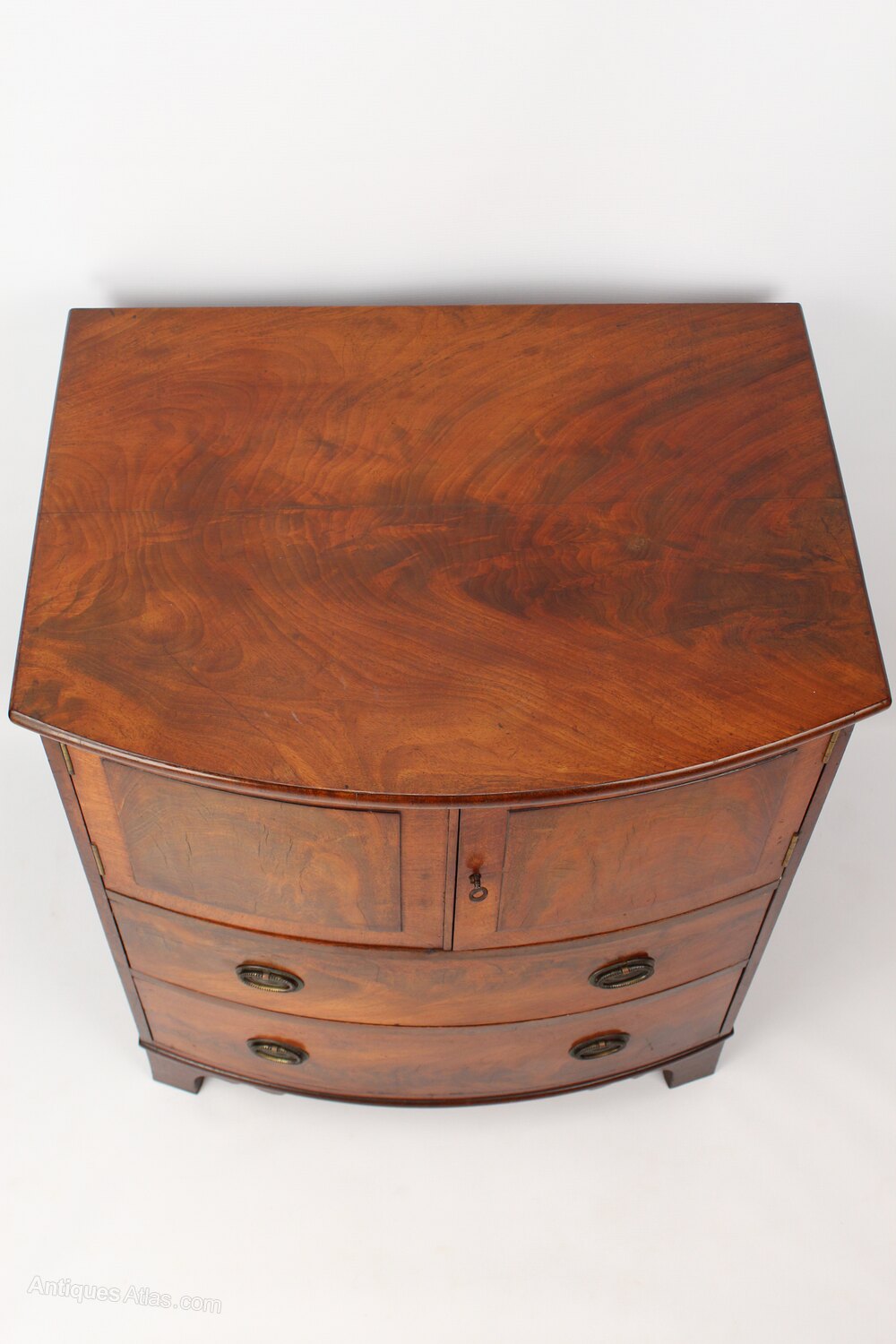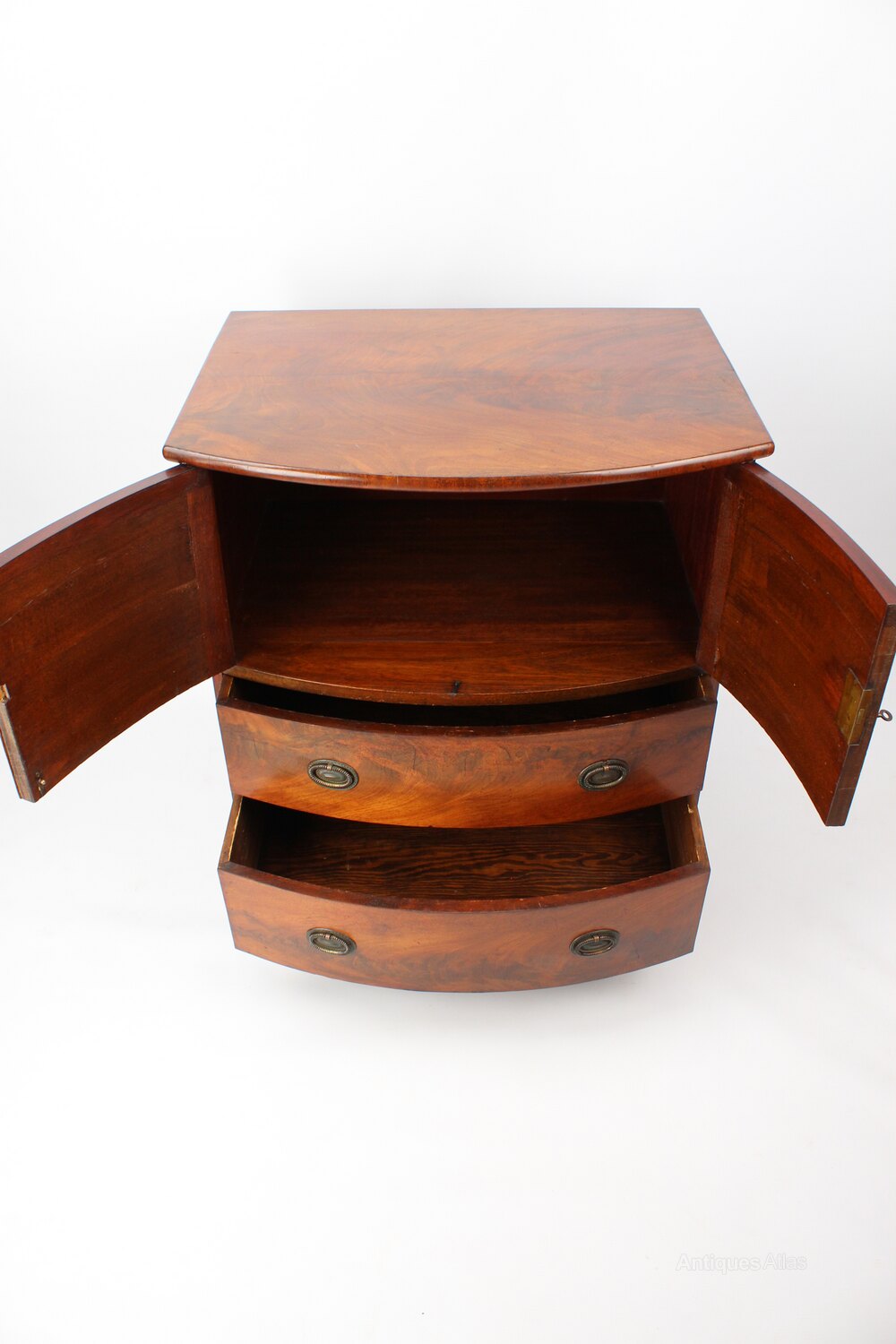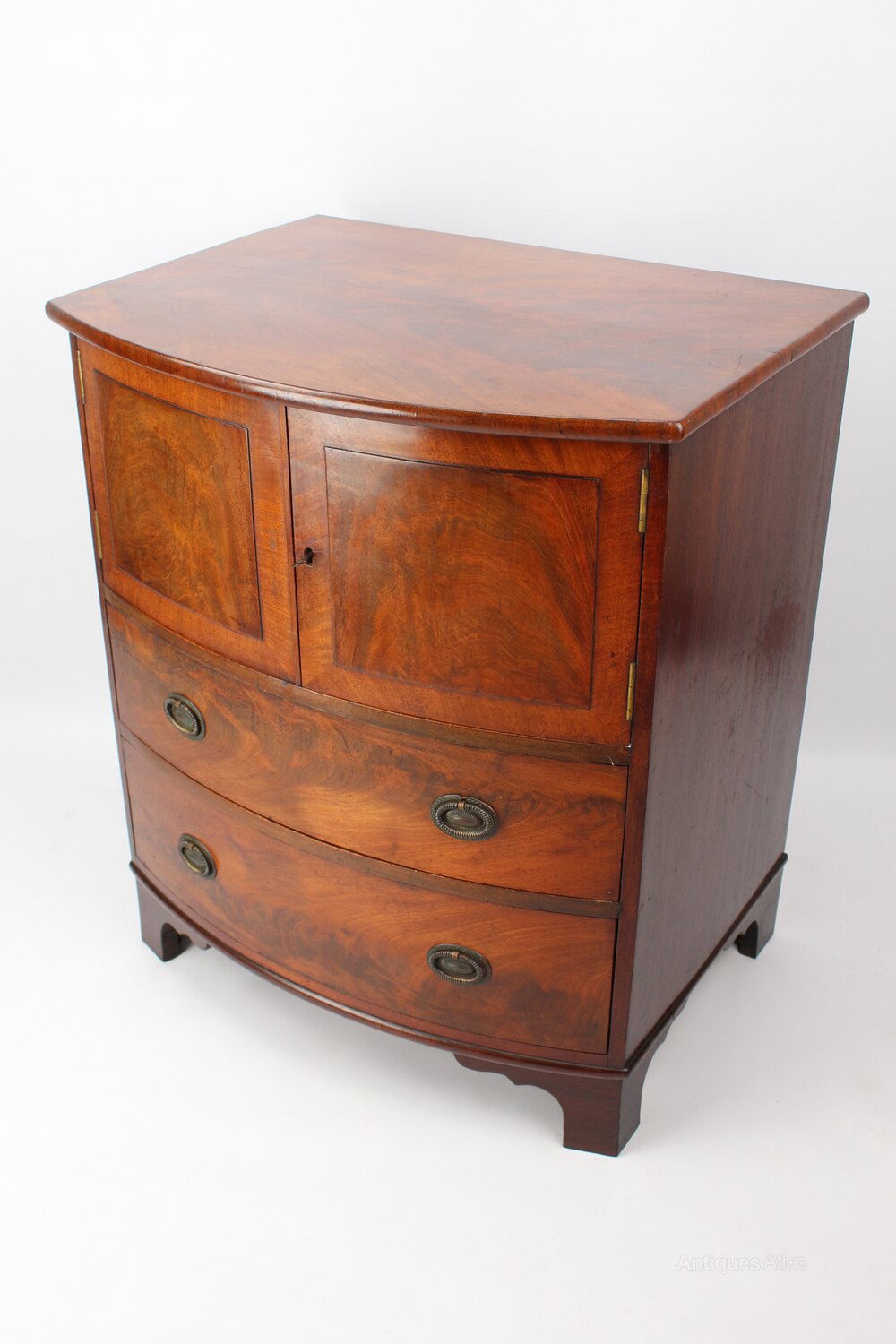 A handsome antique Georgian bow front side cabinet in figured mahogany dating from circa 1820, converted from a commode. With cupboard over 2 drawers and standing on shaped bracket feet it has beautifully figured mahogany to the front and top and has attractive brass drop handles. This piece would have originally started life as a commode / chamber pot cupboard and has been converted into a side cabinet at some point. A high quality piece it would make a lovely side cabinet, hall cupboard or TV unit.