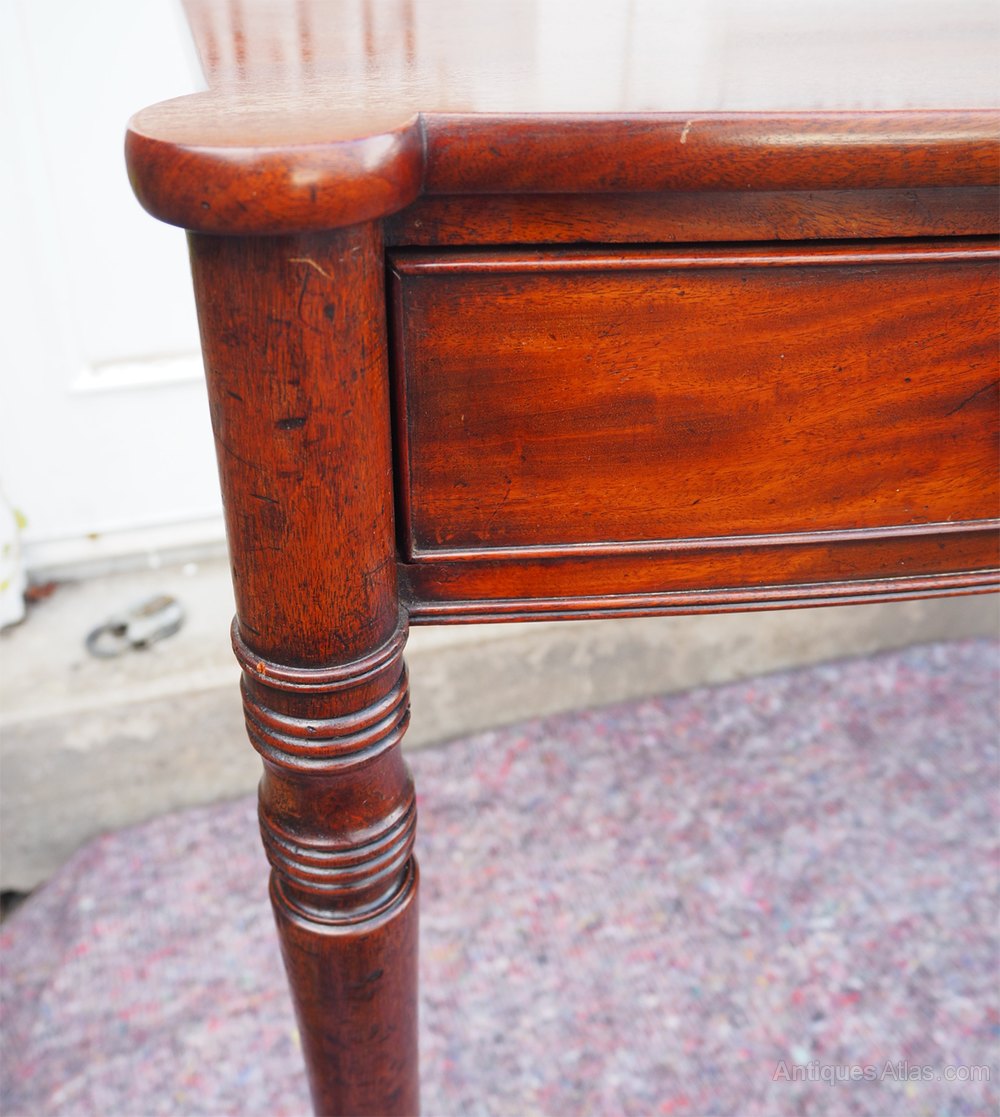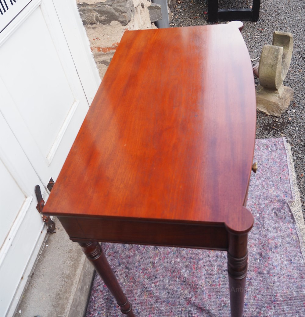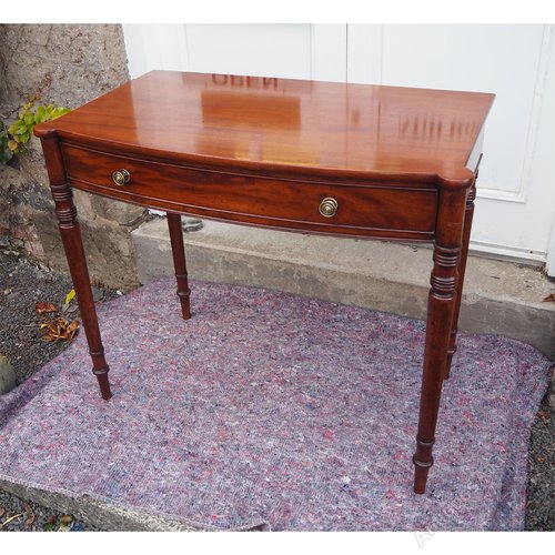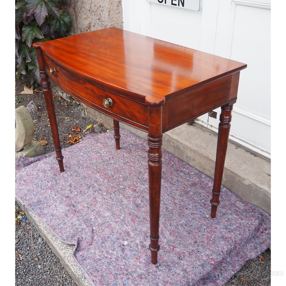 Good Georgian mahogany bow-fronted, single drawer, side table. Nicely turned legs which form part of the design of the table at the top. Single drawer with cock beaded edge, oak lined with brass knobs. The table has double reed moulded decoration in various places. The table is a really nice shape. Condition is very good with no issues at all. I think the top has been sympathetically re-polished at some time in the past.