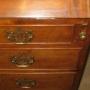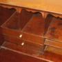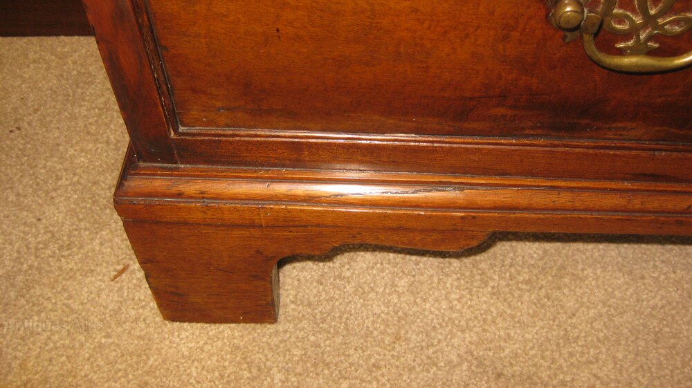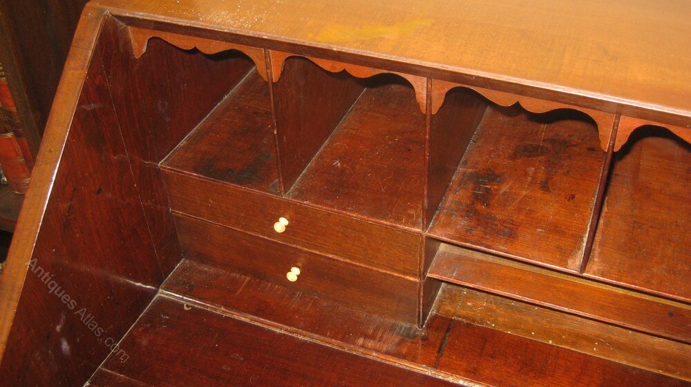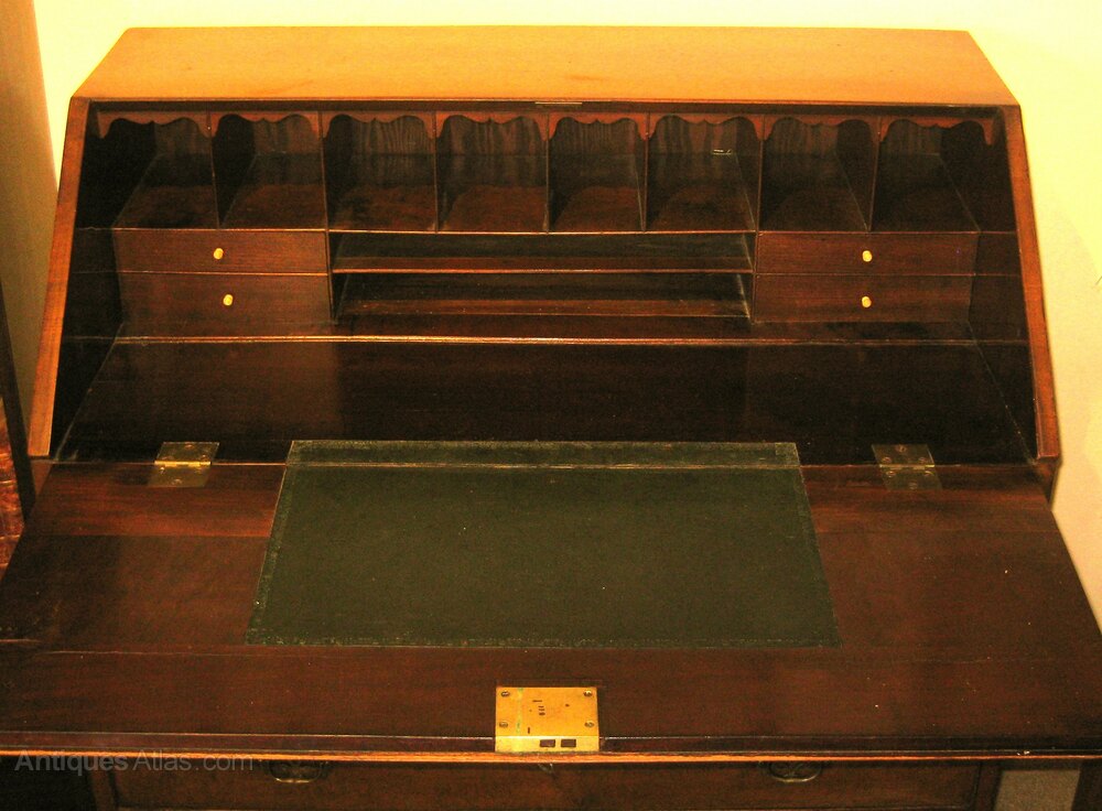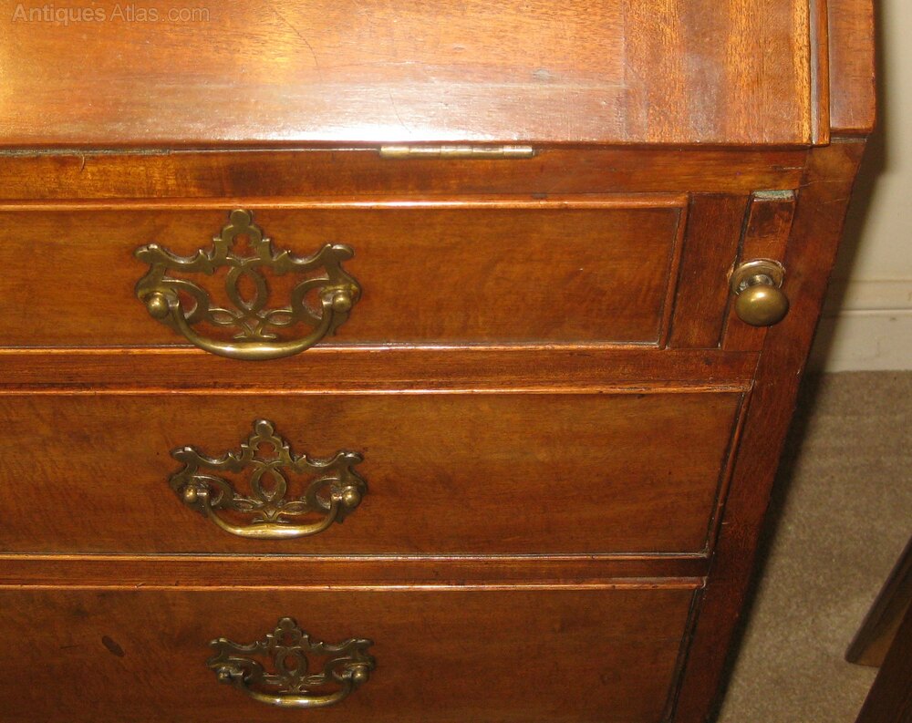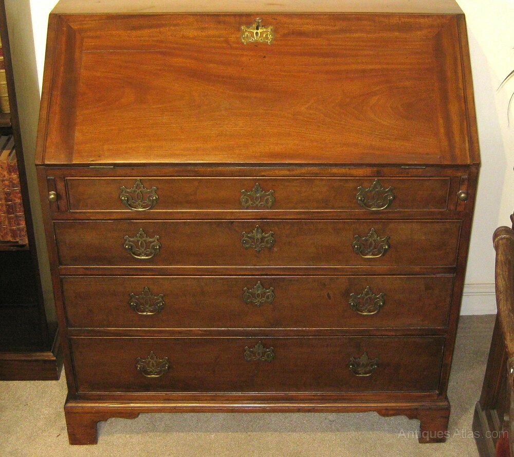 Georgian mahogany bureau. The locking fall opening to reveal a pretty interior with small drawers and leathered writing area. Below are 4 large cock beaded drawers of a good, hand cut, dovetailed construction with oak linings and the original pierced fret brass plate handles, all with working locks. Standing on bracket feet.
