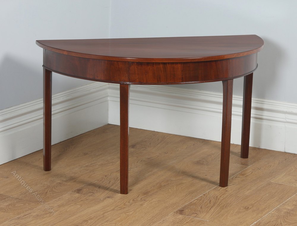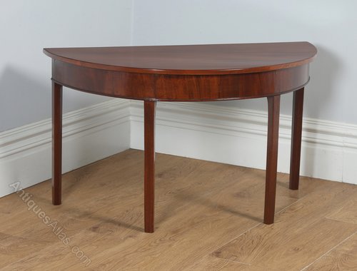This is a fine quality antique English Georgian mahogany demi-lune console table, circa 1790, in excellent original condition.