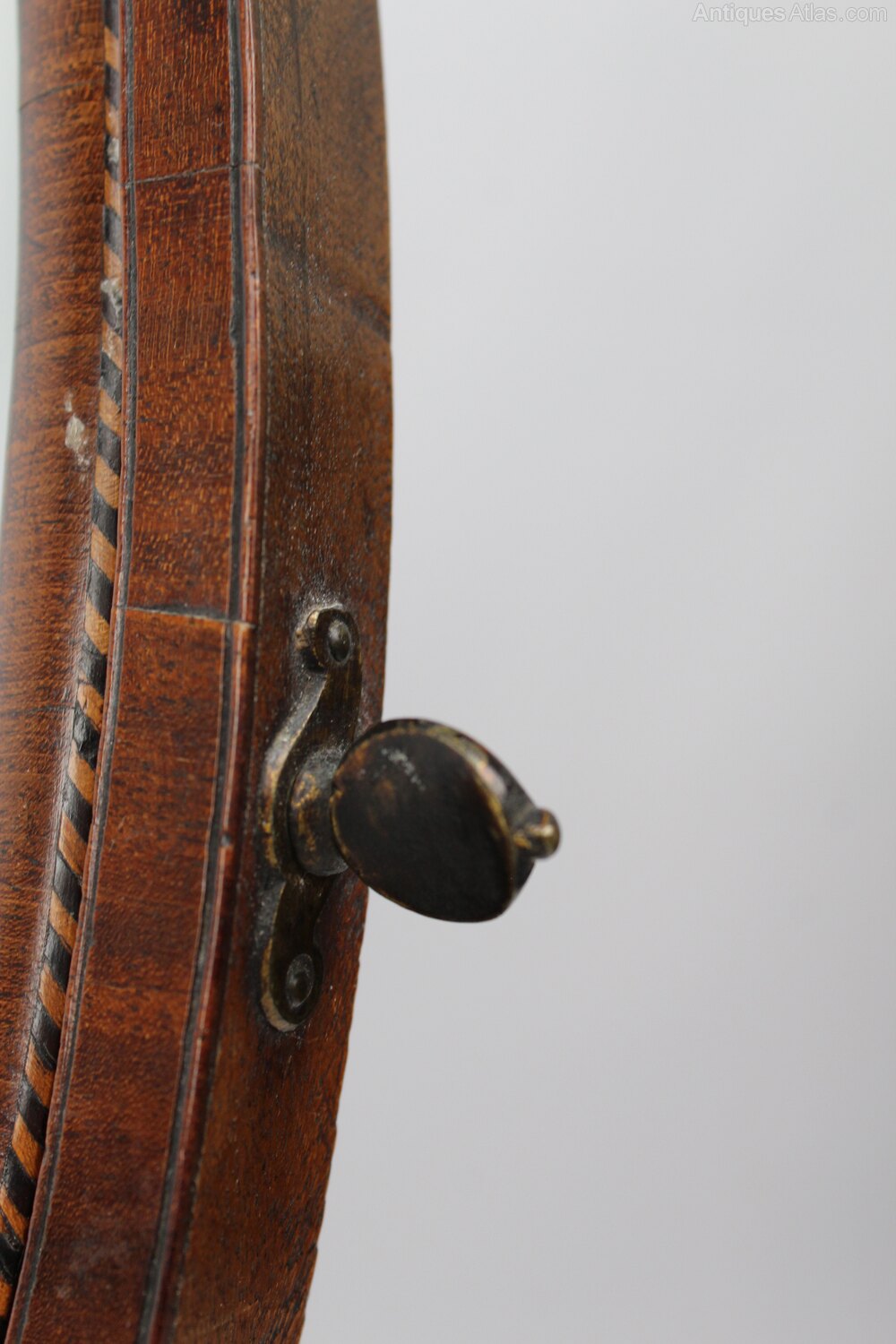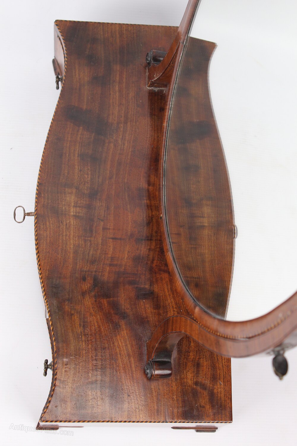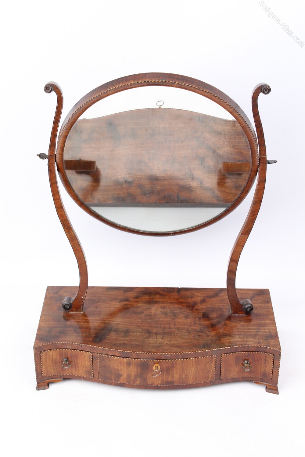 An elegant antique Georgian mahogany serpentine fronted oval dressing table mirror or toilet mirror dating from circa 1790. With beautifully figured mahogany serpentine shaped base with three drawers, the oval mirror plate in swing frame with shaped supports, all standing on small ogee bracket feet. The central drawer locks and comes with a working key and it is profusely inlaid throughout with ebony and boxwood barber’s pole banding. A really good quality and attractive example in good condition.