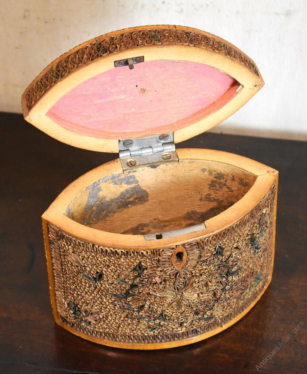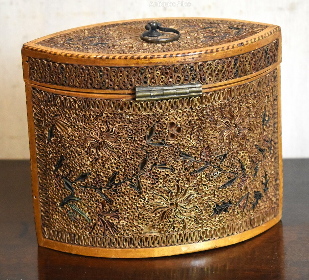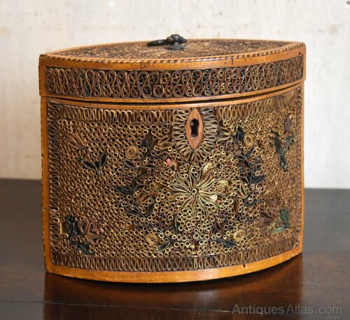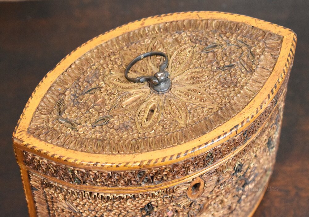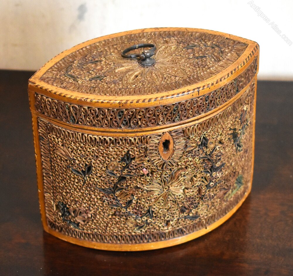 A fine and rare Georgian period tea caddy of navette shape and decorated with paper scrollwork. A superb example of this type of caddy, the box has a base wood of sycamore or boxwood with a striped line inlay around the lid. The navette shape of the box gives two large panels on the sides and also the lid which have been intricately decorated with rolled paper scrollwork. The scrolls have gilded edges arranged in floral motifs and are overall in good condition with the odd small areas of loss. The tea caddy is in extremely good untouched condition and is a fine and rare example. C.1790