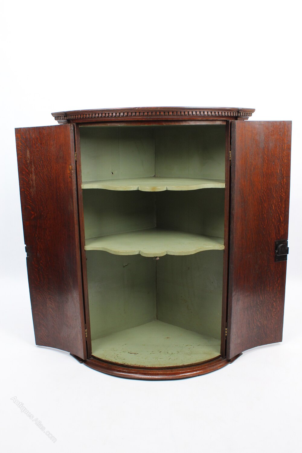 A handsome antique Georgian oak bow front corner cupboard dating from circa 1800. Of bowed form with moulded dentil cornice over two doors enclosing 2 shaped shelves with light green painted interior. It has fancy brass escutcheons and brass H-hinges and beautifully figured quarter-sawn oak doors with mahogany banding to the edges above a shaped pelmet. It locks and comes with a working key. Complete with hanging brackets.
