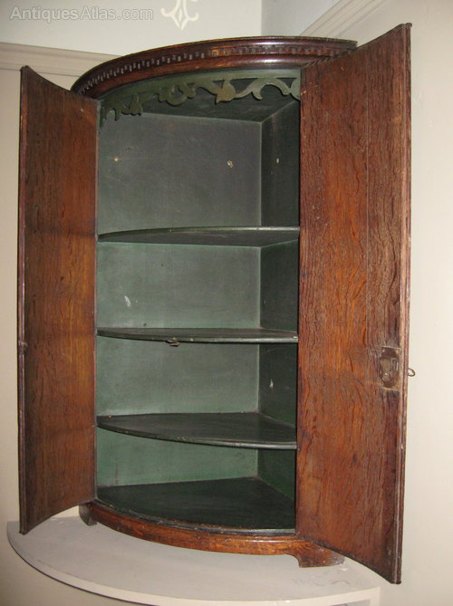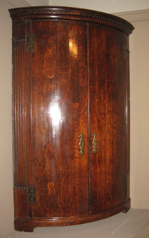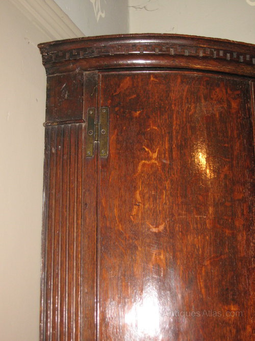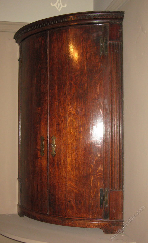 A fine and original example of a Georgian oak bowfront corner cupboard, in excellent original condition. The cupboard has a lovely original colour and great figuring. The cupboard opens with twin doors bordered by readed pilasters to the sides, with a dentil cornice. The interior retain the original paintwork and has a wonderful fretwork top. This is a great example of its type with a lovely colour and in excellent original condition, with working key. C.1780.