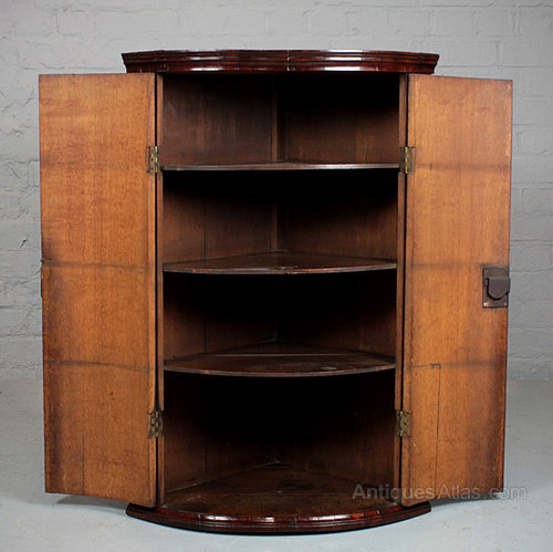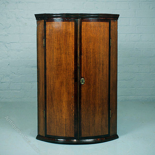 Useful late Georgian oak bow front corner cupboard c.1810. Mahogany crossbanding, oak shelves and backboards. Excellent condition, cleaned and polished in our workshops. Key supplied.