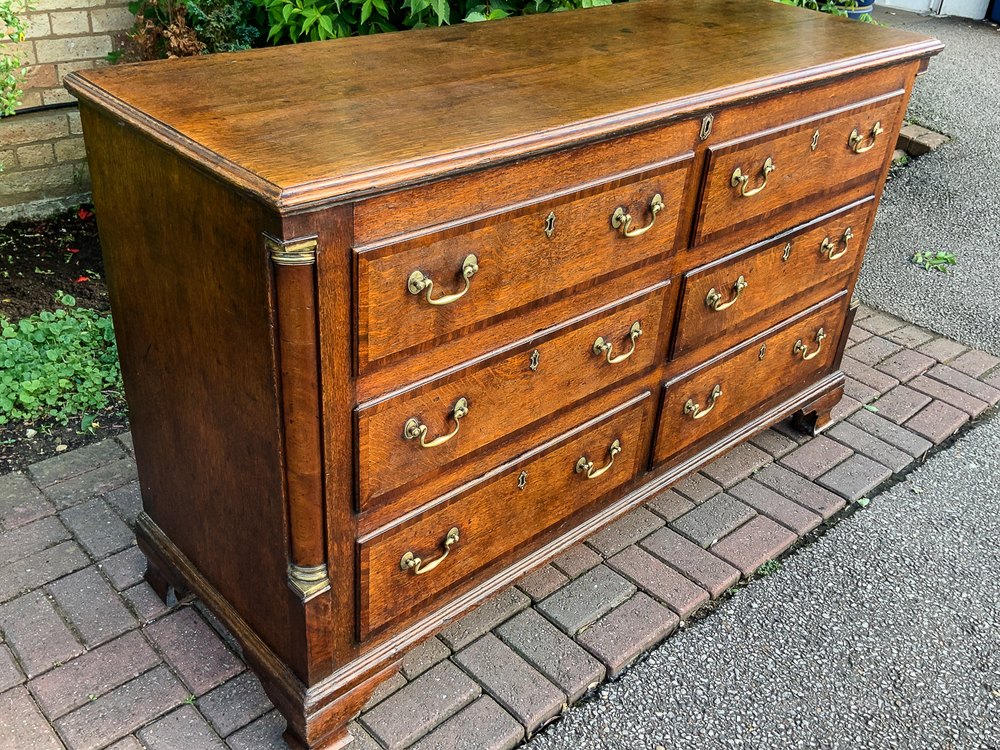 A Good 18th century Dower Chest in Oak with Walnut cross banding, it has six drawers two of which (top two) are false drawers as the top lifts up, this is the standard formation for these items (dower Chests) it stands on Ogee bracket feet and has plain quarter colomn corners with brass capitals and plinths. The condition is excellent with a pleasing colour and patina.