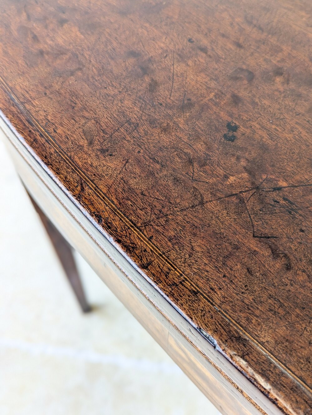 A refined late Georgian tea table Veneered in plum-pudding mahogany with contrasting crossbanding and delicate line inlay. The rectangular top with rounded front corners folds open on brass hinges to reveal a plain mahogany surface, supported by a single swing leg to form a larger surface.